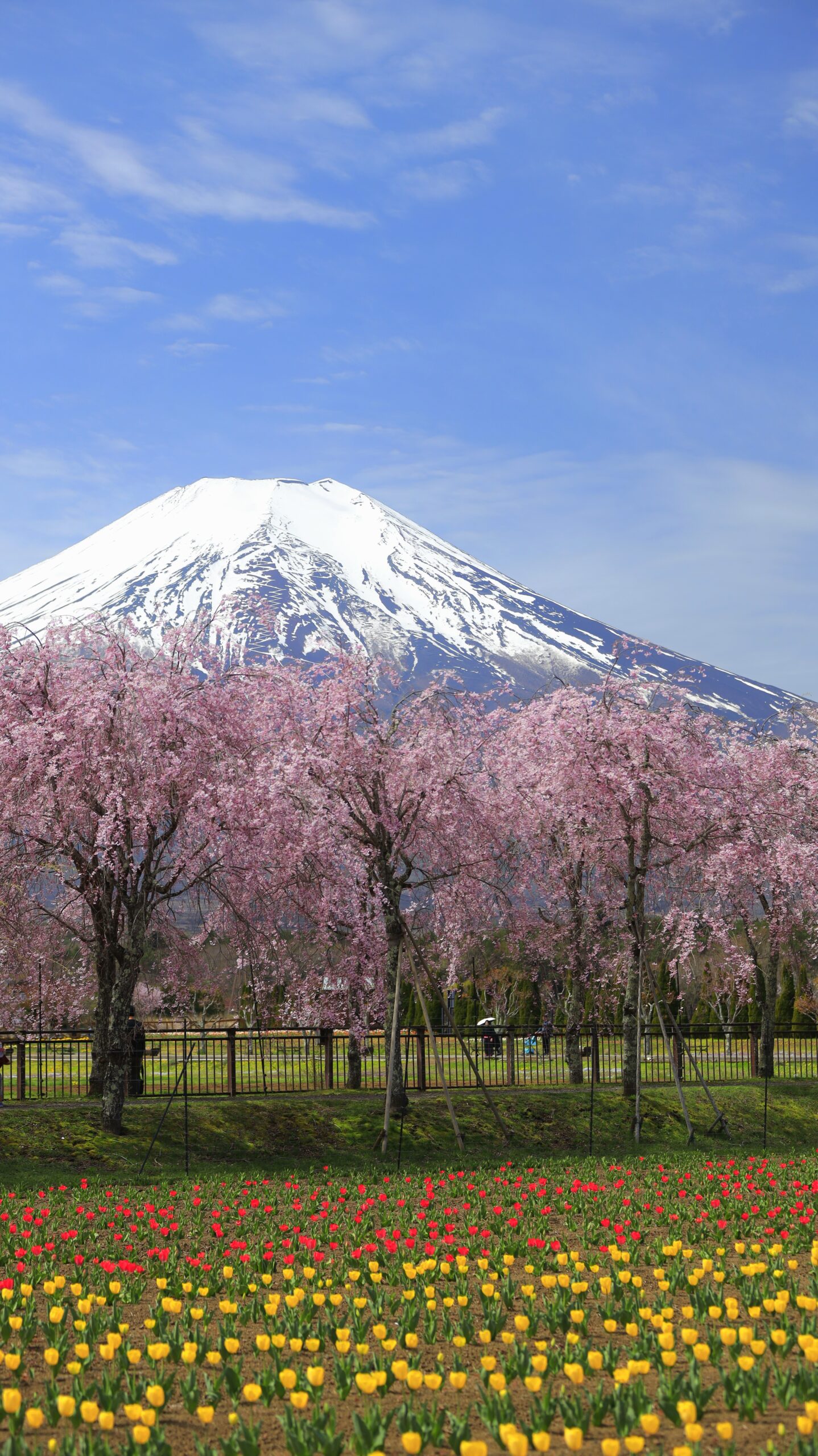 この写真は、山中湖花の都公園で、斜めの位置からチューリップ畑と富士山、そして八重枝垂れ桜を組み合わせ、奥行きを強調して撮影したものです。