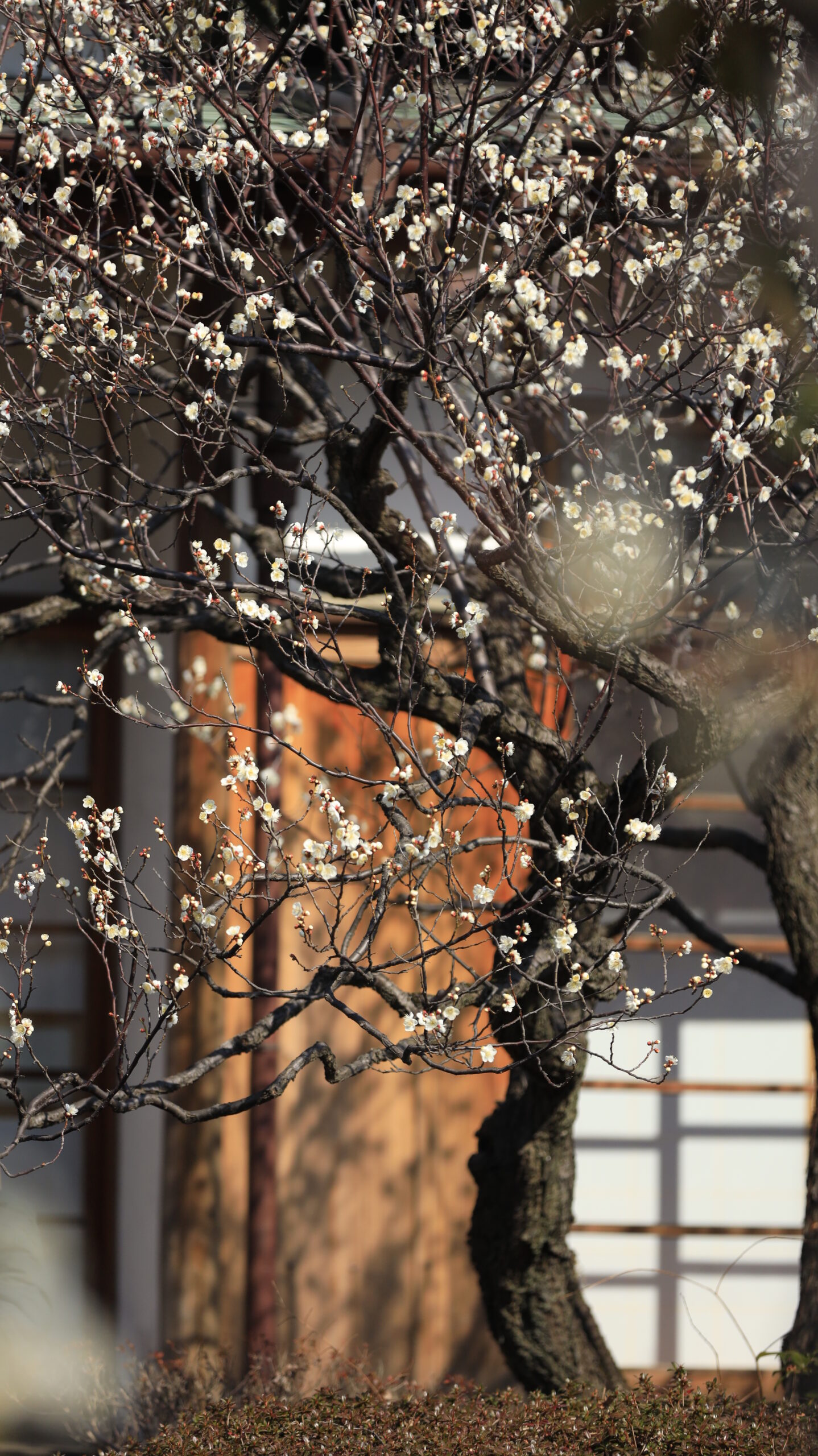 この写真は、向島百花園で、建物に映る梅の影を意識しながら花を撮影し、印象的なシルエットを表現しました。