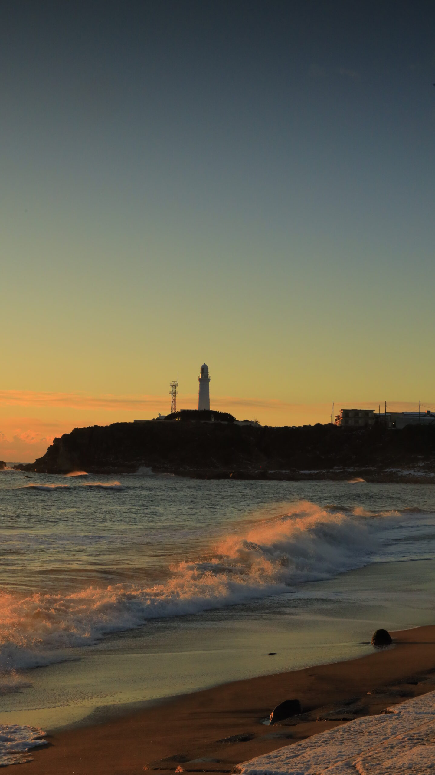 犬吠埼で、早朝の波に太陽の光が当たり波がうっすら赤くなる様子を撮影した画像