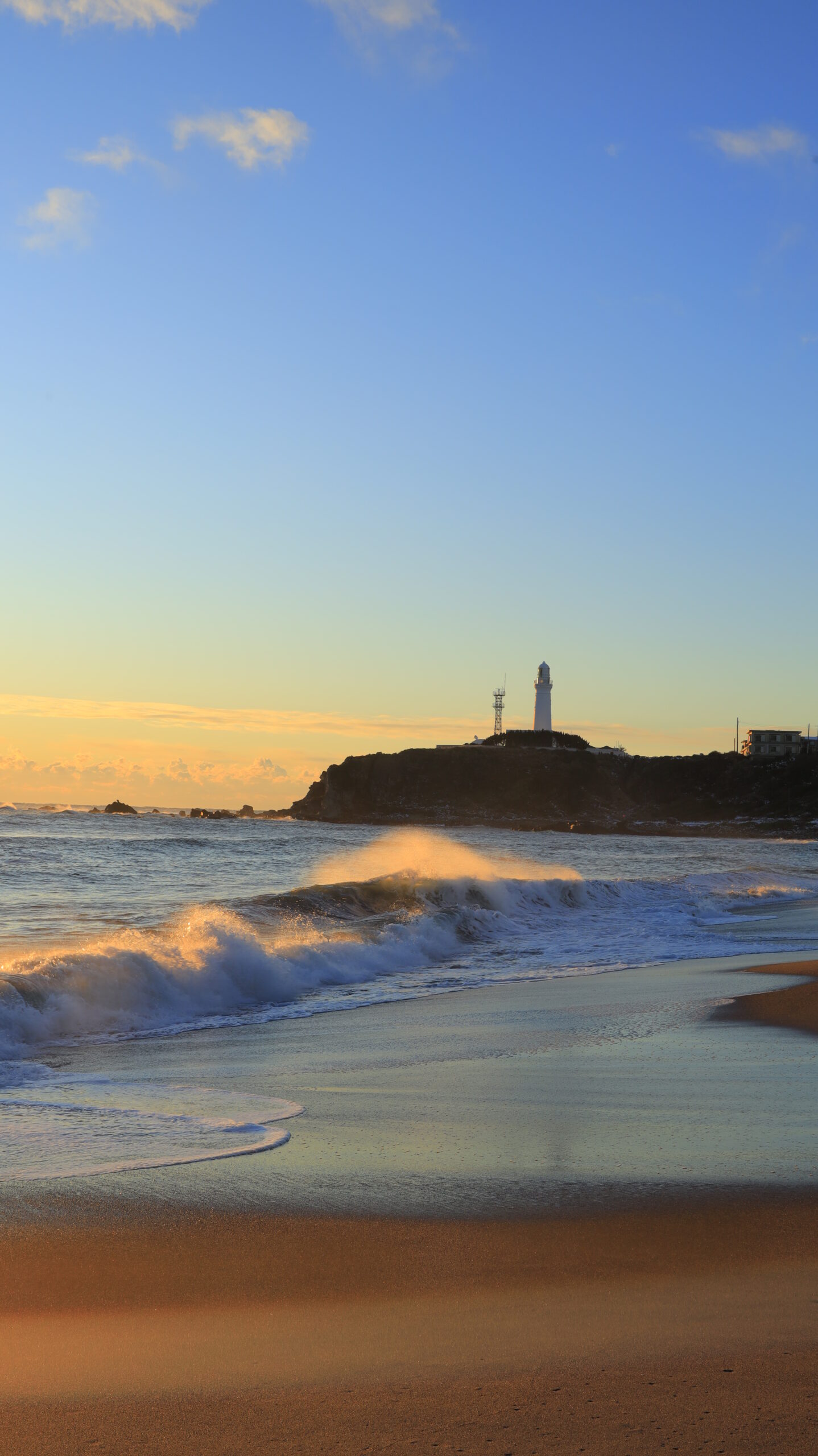 この写真は、犬吠埼で、青い空と波、灯台の様子を撮影したものです。朝の青さが出る時間帯を意識しています。