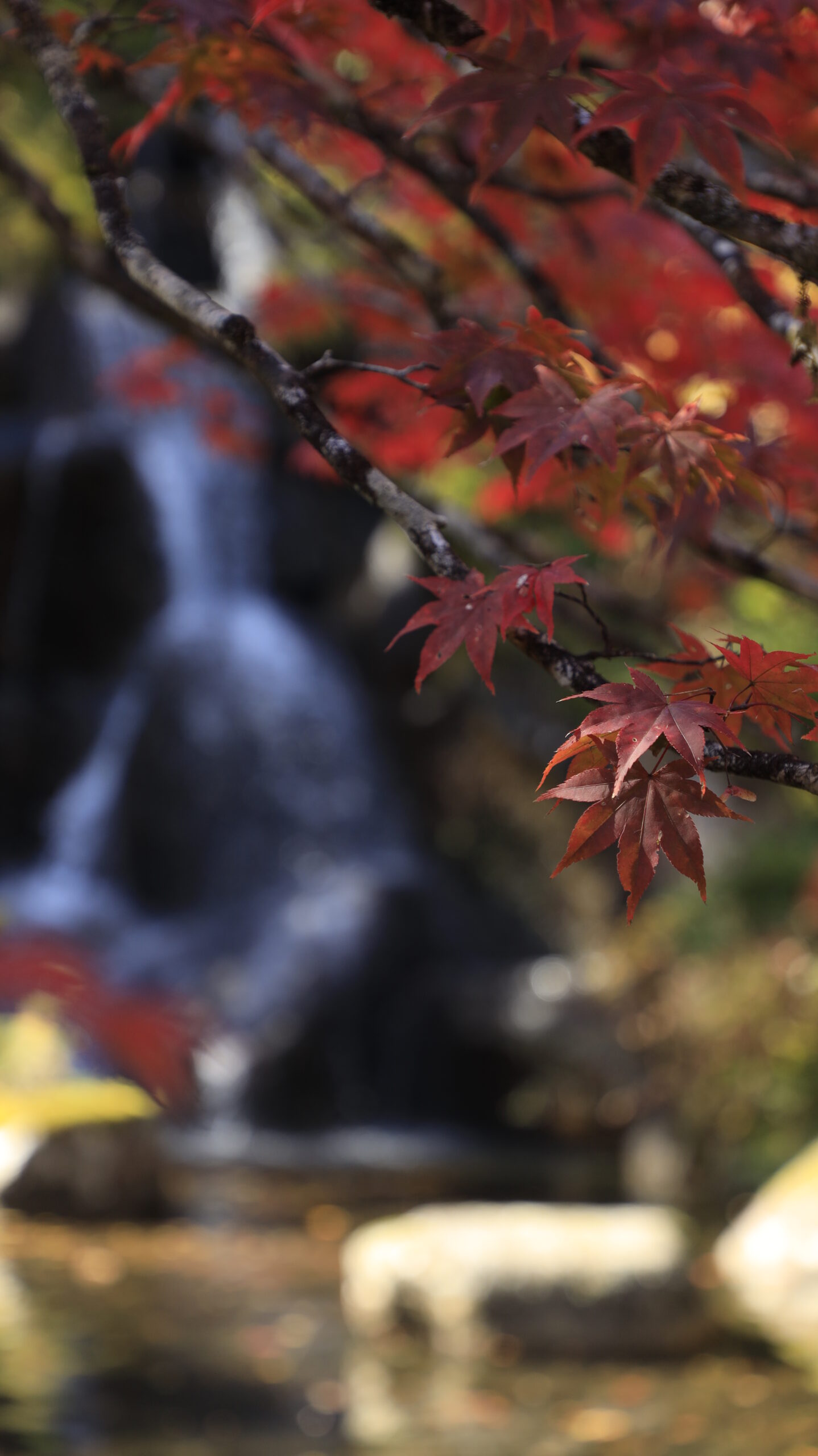 この写真は、古峯神社で、形の整った手前のもみじにピントを合わせ、奥に流れる滝をぼかしたもので、奥行きと柔らかな雰囲気を表現しています。