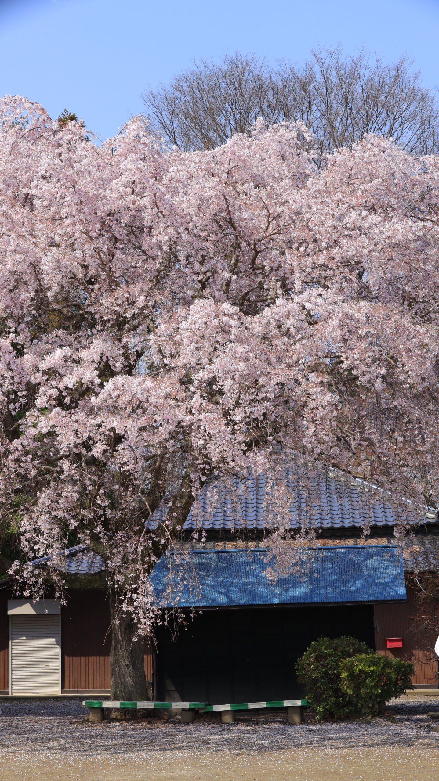 放光寺(石戸宿しだれ桜)|薄ピンクの枝垂れ桜と建物の構図