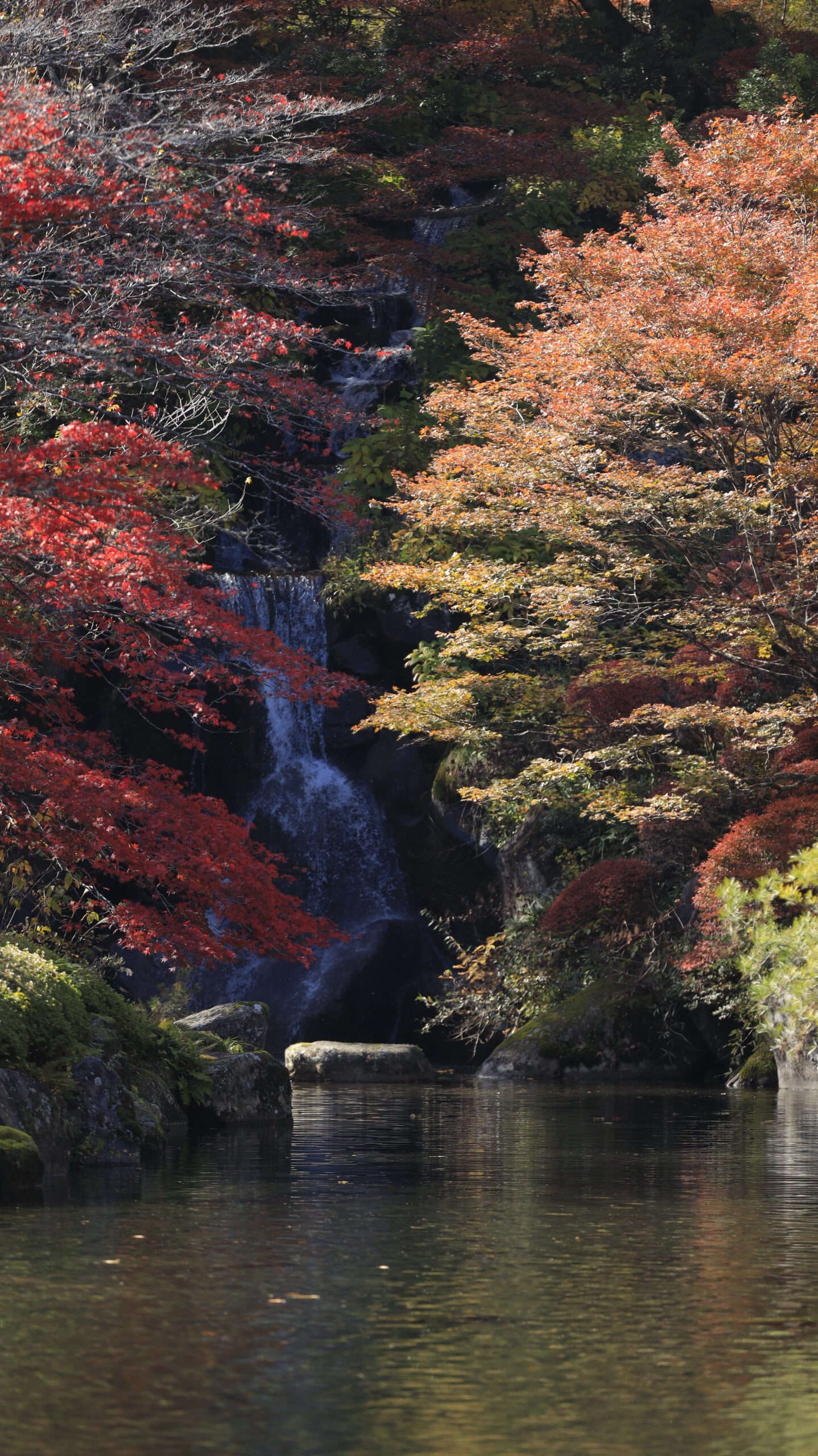 この写真は、古峯神社で、池を挟んで遠くから紅葉と滝を撮影したもので、水面に映る色と音が心地よい穏やかな秋の風景です。
