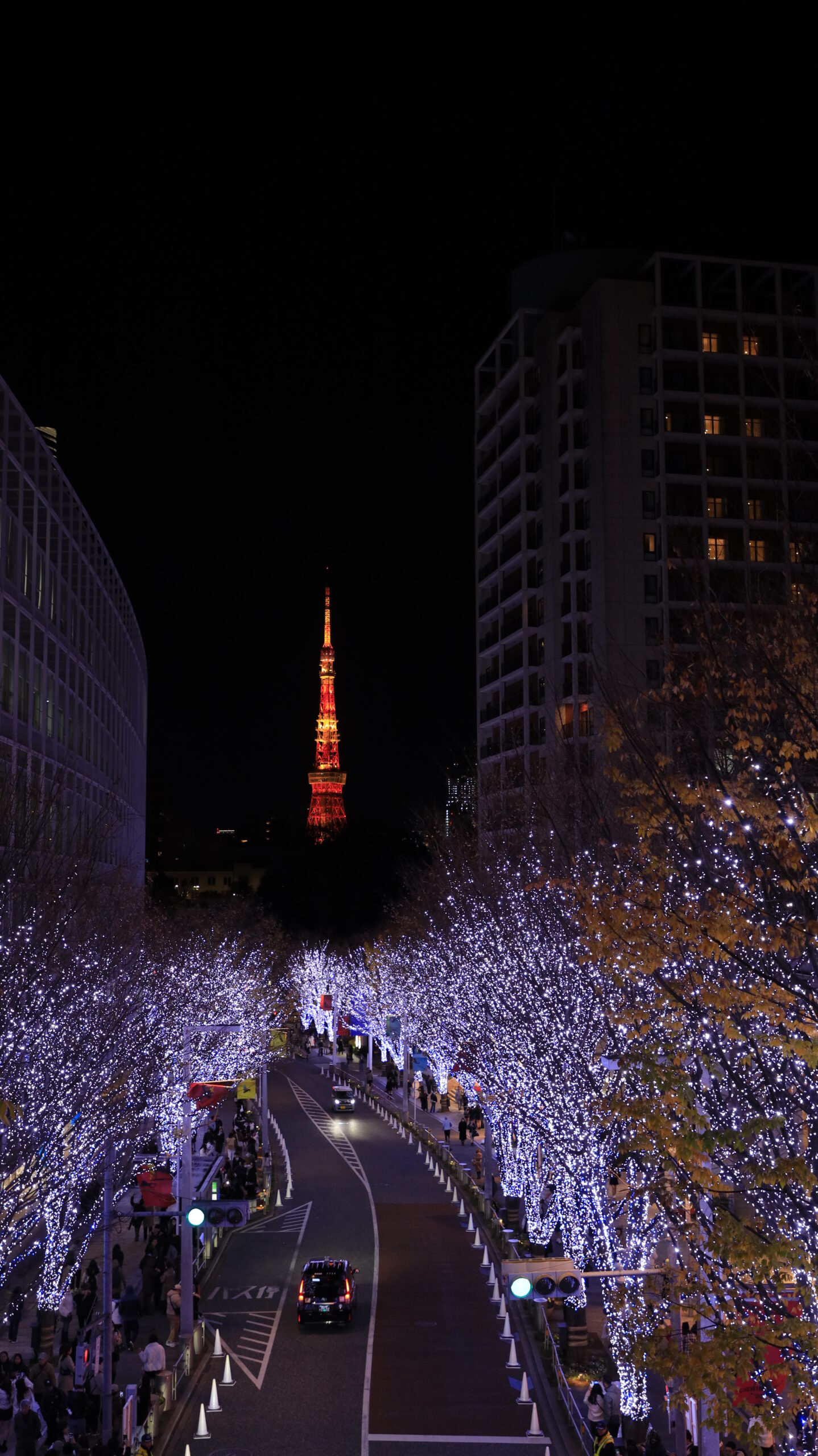 この写真は、六本木けやき坂イルミネーションで、イルミネーションを主役にしつつ、少し小さめに東京タワーを配置して撮影したものです。