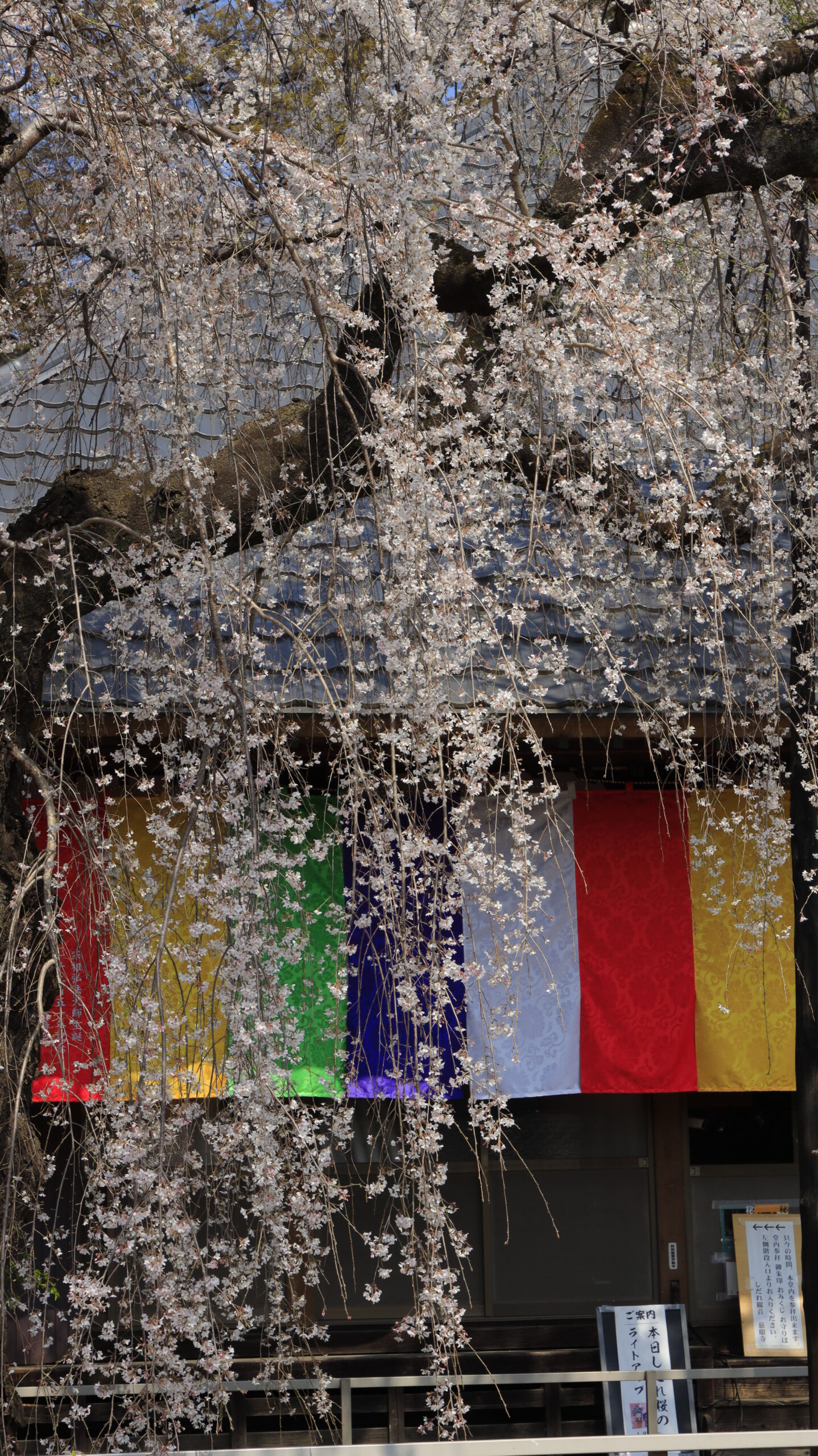 この写真は、慈眼寺のシダレザクラで、正面からアップで枝垂れ桜を撮影し背景にお寺を入れた構図で撮影したものです。