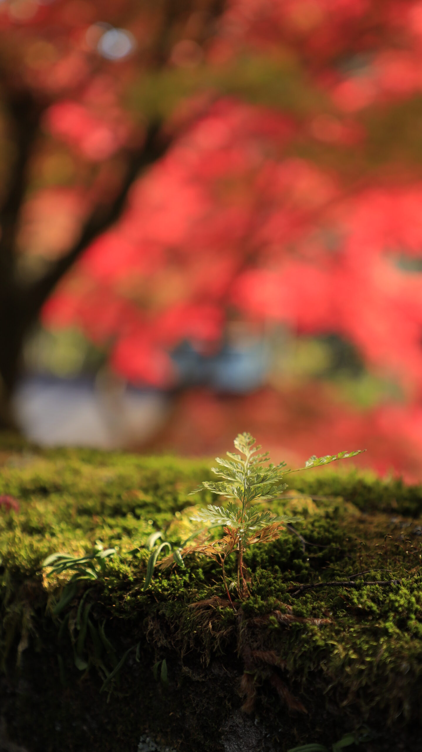 この写真は、古峯神社で、真っ赤に色づいた紅葉を背景に苔を撮影したもので、自然の静寂と生命力を感じさせる落ち着いた雰囲気です。
