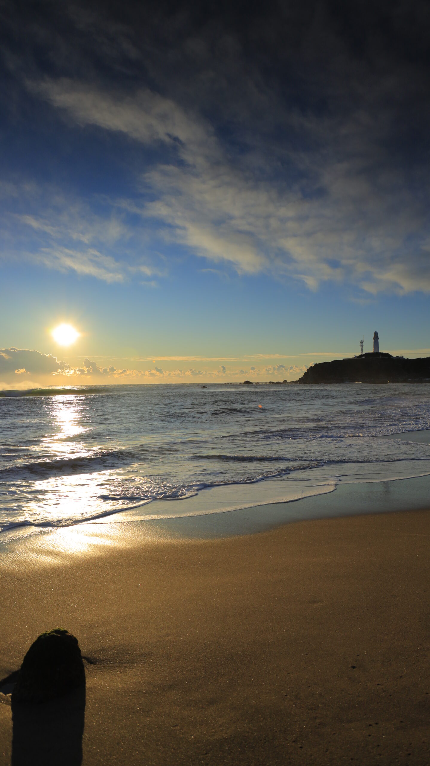 この写真は、犬吠埼で、朝の砂浜と灯台の様子を撮影したものです。海辺の静けさが伝わるようにしています。