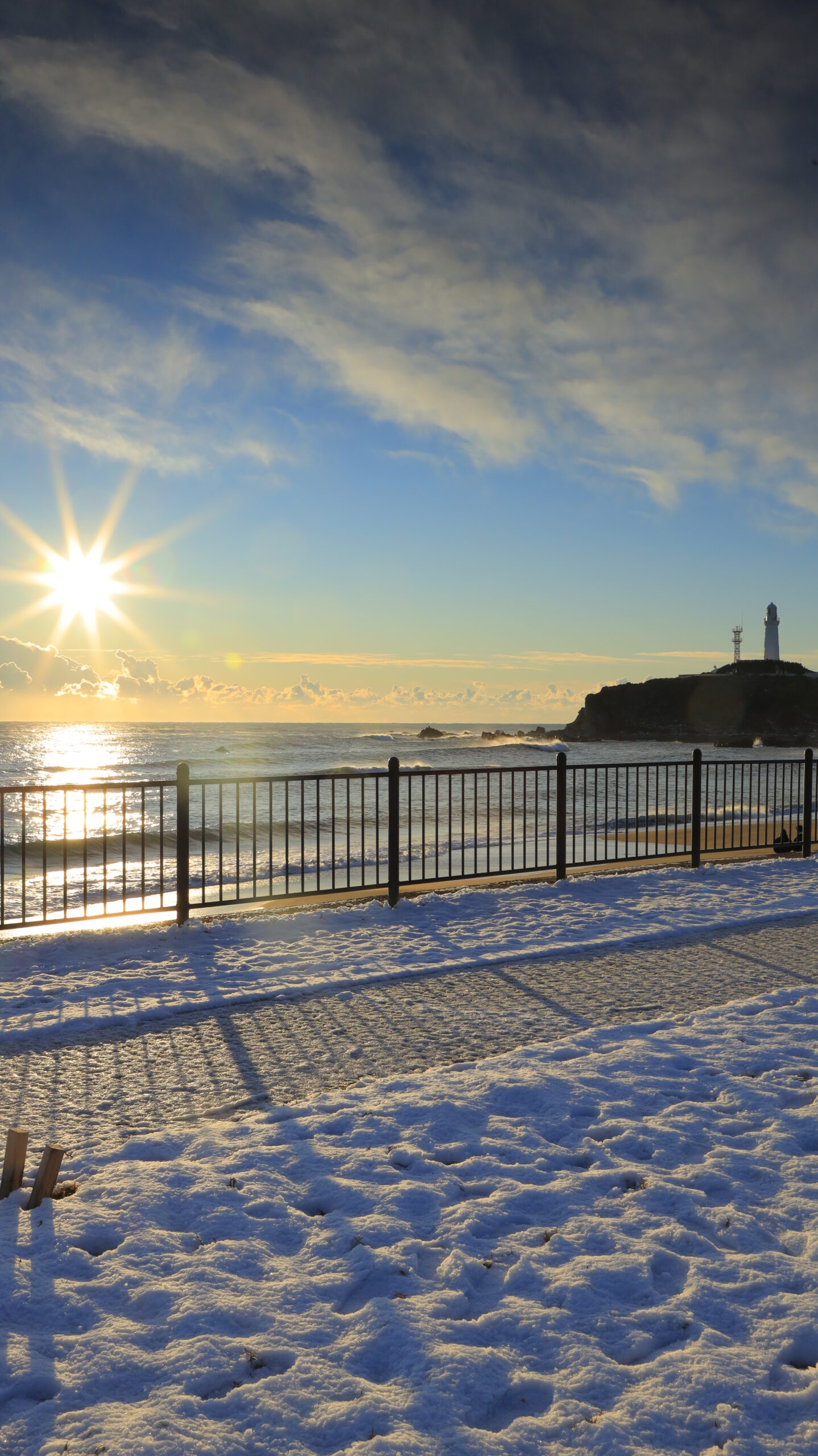 犬吠埼で、前日の雪と朝の太陽と灯台の様子を撮影した画像