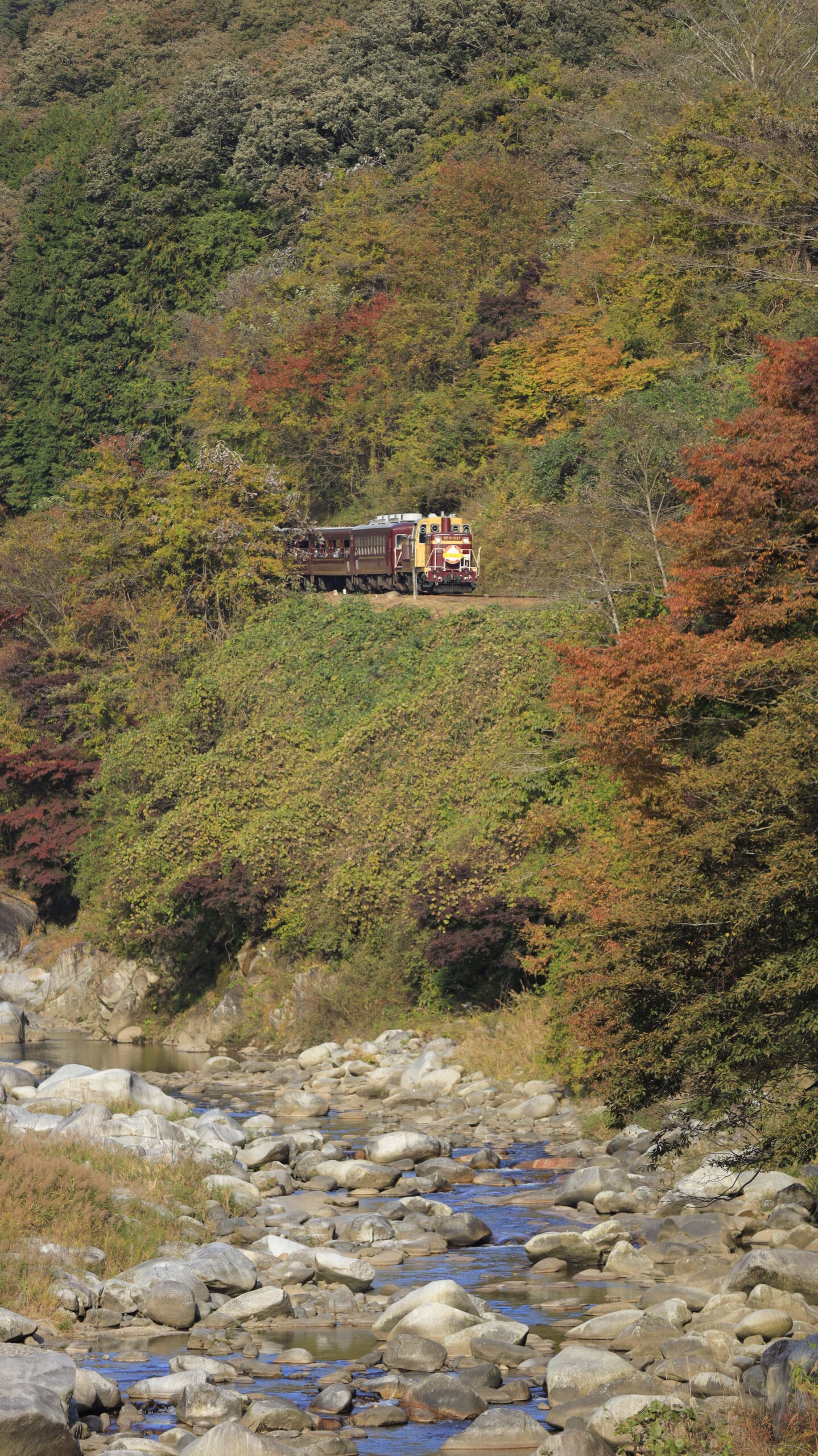 この写真は、沢入駅(わたらせ渓谷鐵道)付近の橋の上から、トロッコわたらせ渓谷号と紅葉を一緒に撮影したもので、鉄道と自然が織りなす秋の風景を楽しめます。