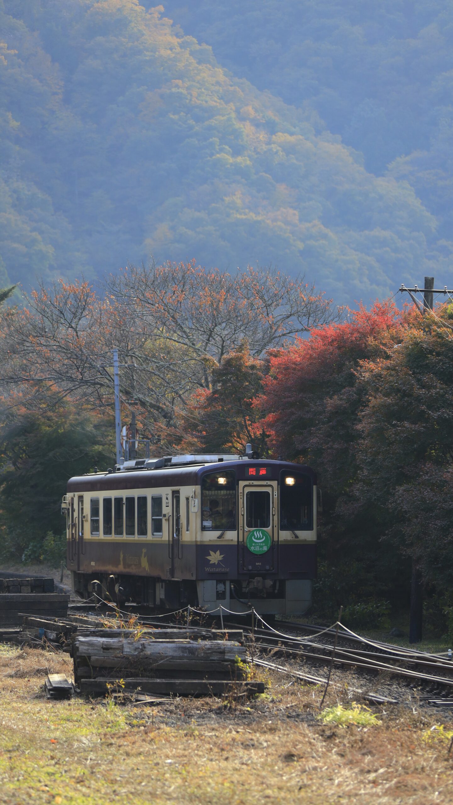 この写真は、沢入駅(わたらせ渓谷鐵道)の踏切から沢入駅へ向かう一両編成の列車を紅葉とともに撮影したもので、のどかで温かみのある秋の情景を表現しています。