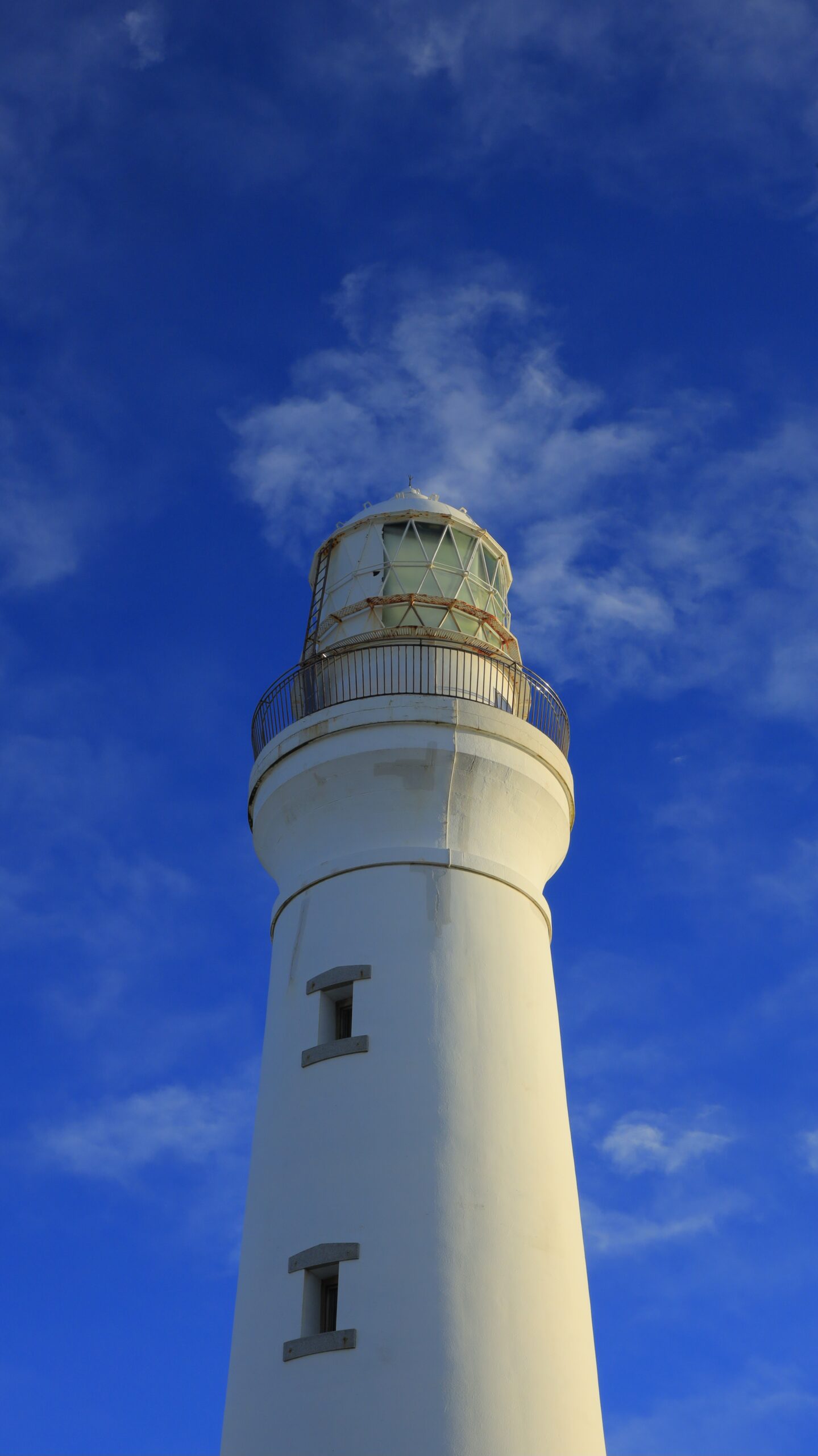 この写真は、犬吠埼で、灯台を下から見上げる形で、青空と一緒に撮影したものです。縦の迫力が出る角度です。
