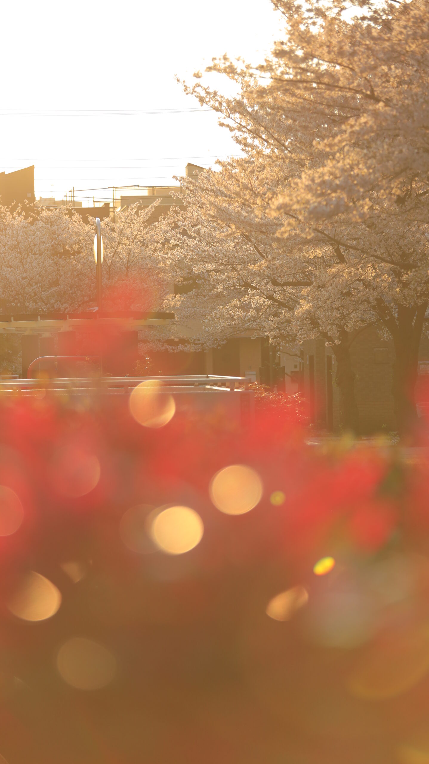 この写真は、尾久の原公園で、赤色の葉越しにソメイヨシノを逆光で捉え、色の重なりと光の透過を意識して撮影したものです。