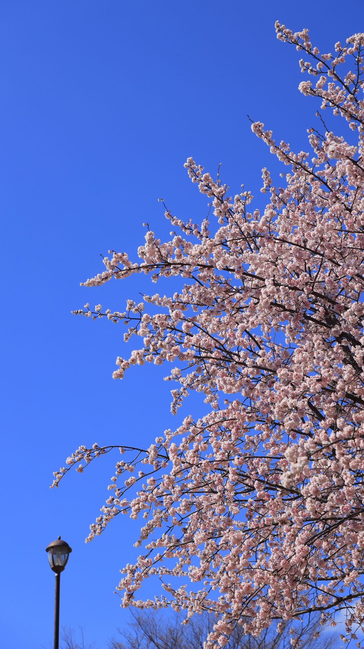 この写真は、汐入公園で、大きく咲く大寒桜と奥に見える街灯を構図に入れて撮影したものです。