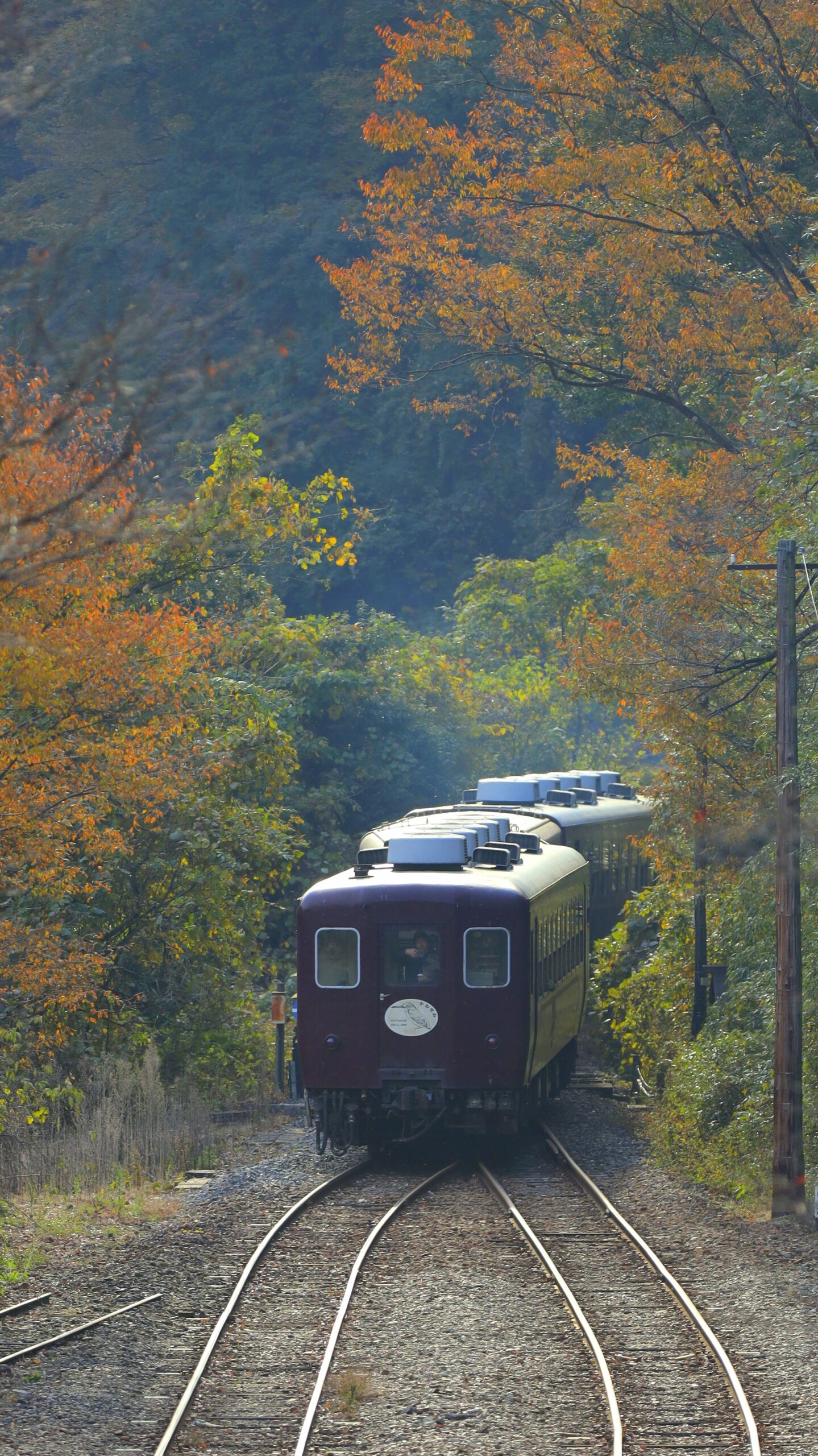 この写真は、神戸駅で、トロッコわたらせ渓谷号が駅を去る瞬間を紅葉とともに撮影したもので、旅の終わりを感じさせる郷愁漂う一枚です。