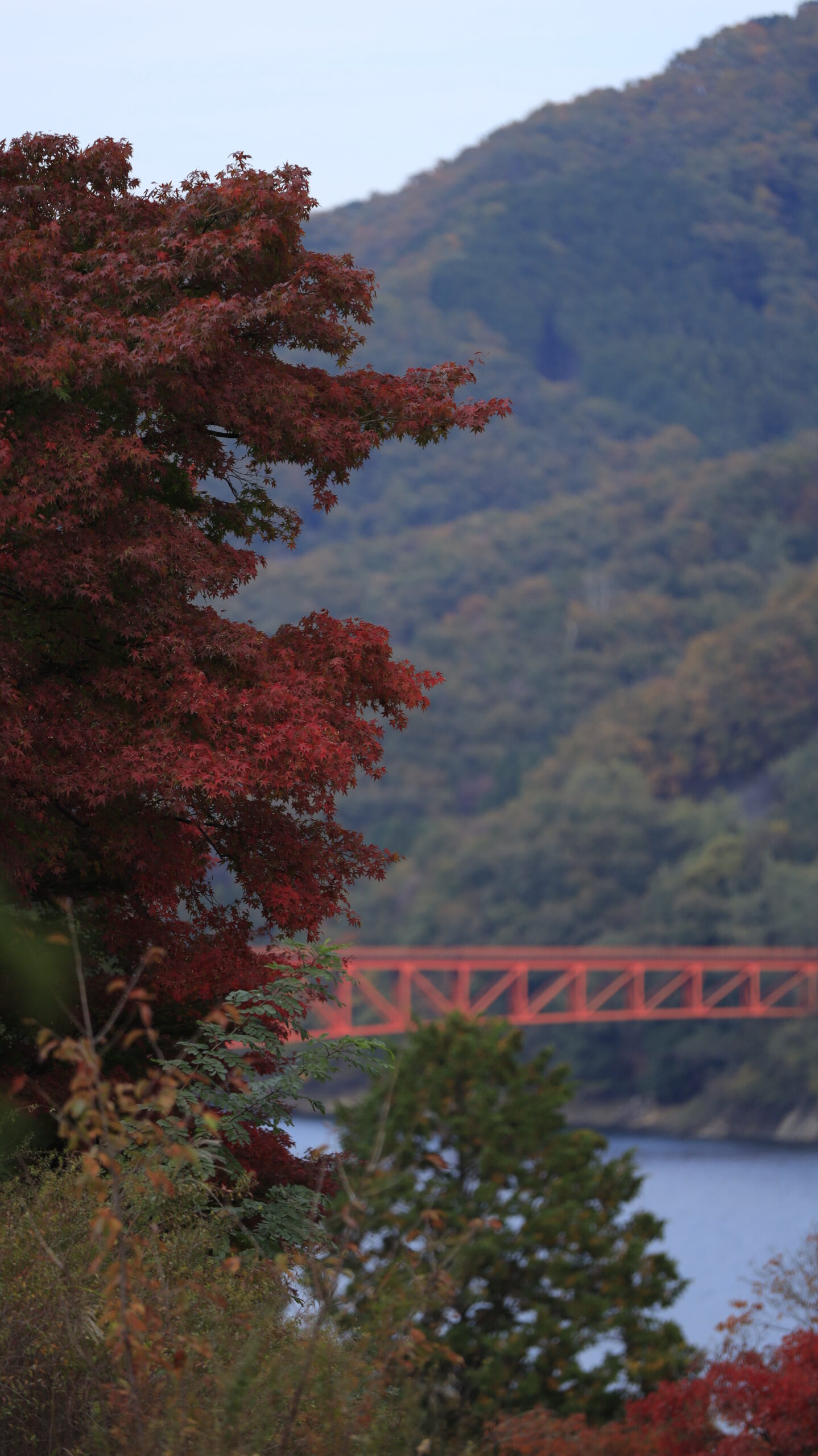 この写真は、草木湖で、色鮮やかな紅葉と奥にかかる草木橋を、もみじにピントを合わせて撮影したもので、自然の奥行きと柔らかさを感じさせます。