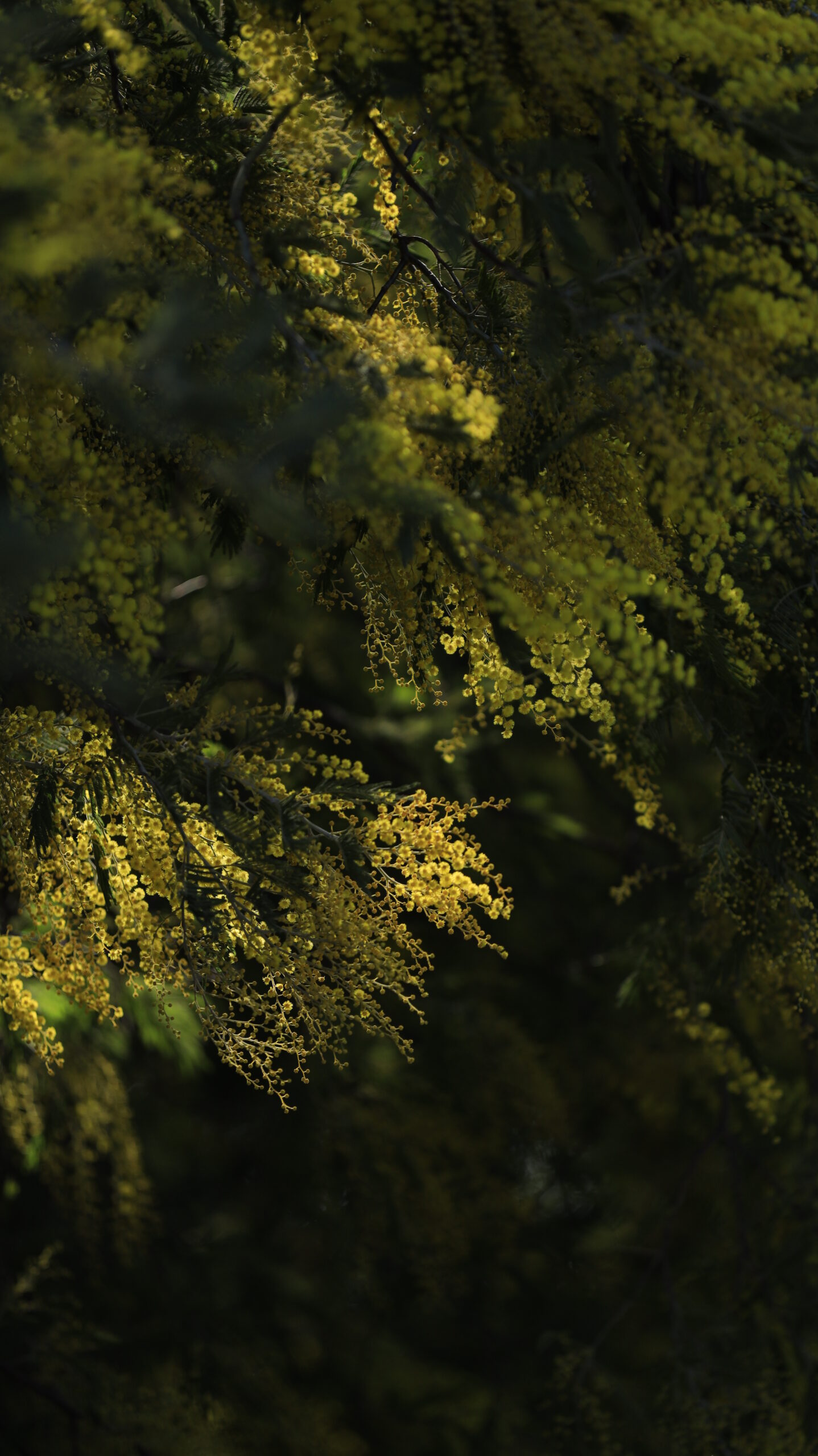 この写真は、入船公園で、ダークなトーンで陰陽を意識しながらミモザの花を撮影したものです。光と影が織りなす世界観を描きました。