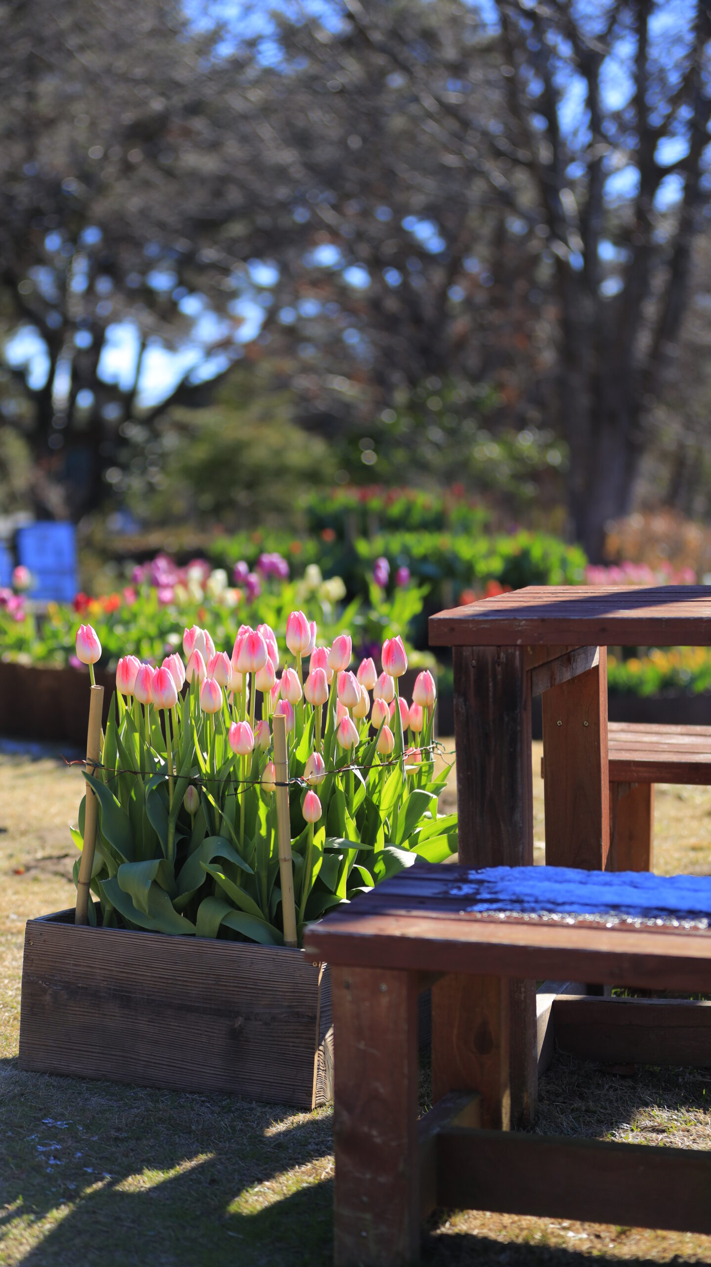 この写真は、国営ひたち海浜公園で、アイスチューリップの花壇の様子を撮影したものです。花壇全体の広がりが分かるようにしています。