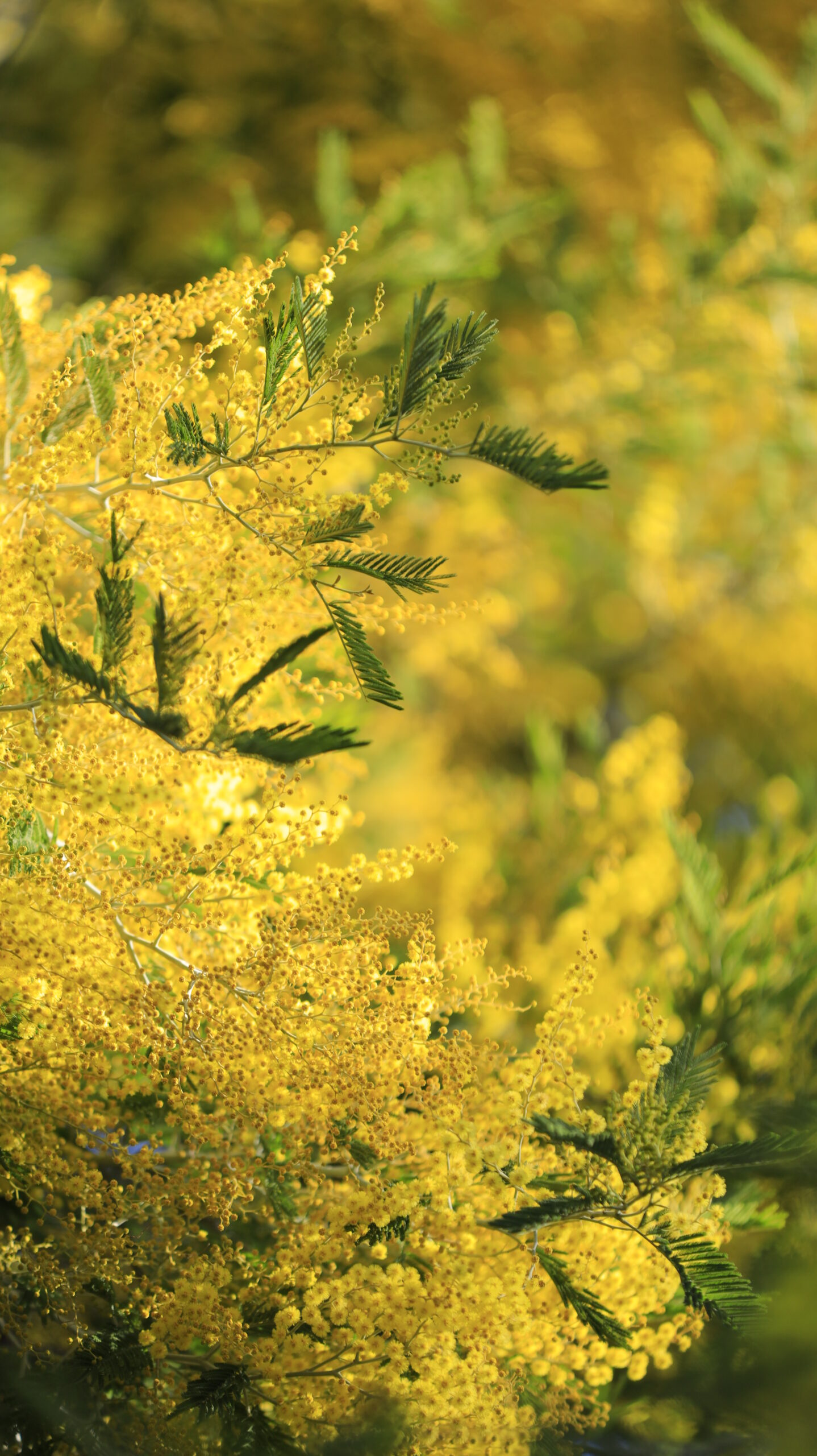 この写真は、入船公園で、キラキラと輝く黄金色のミモザを撮影したものです。春の象徴ともいえる鮮やかな黄色が印象的です。