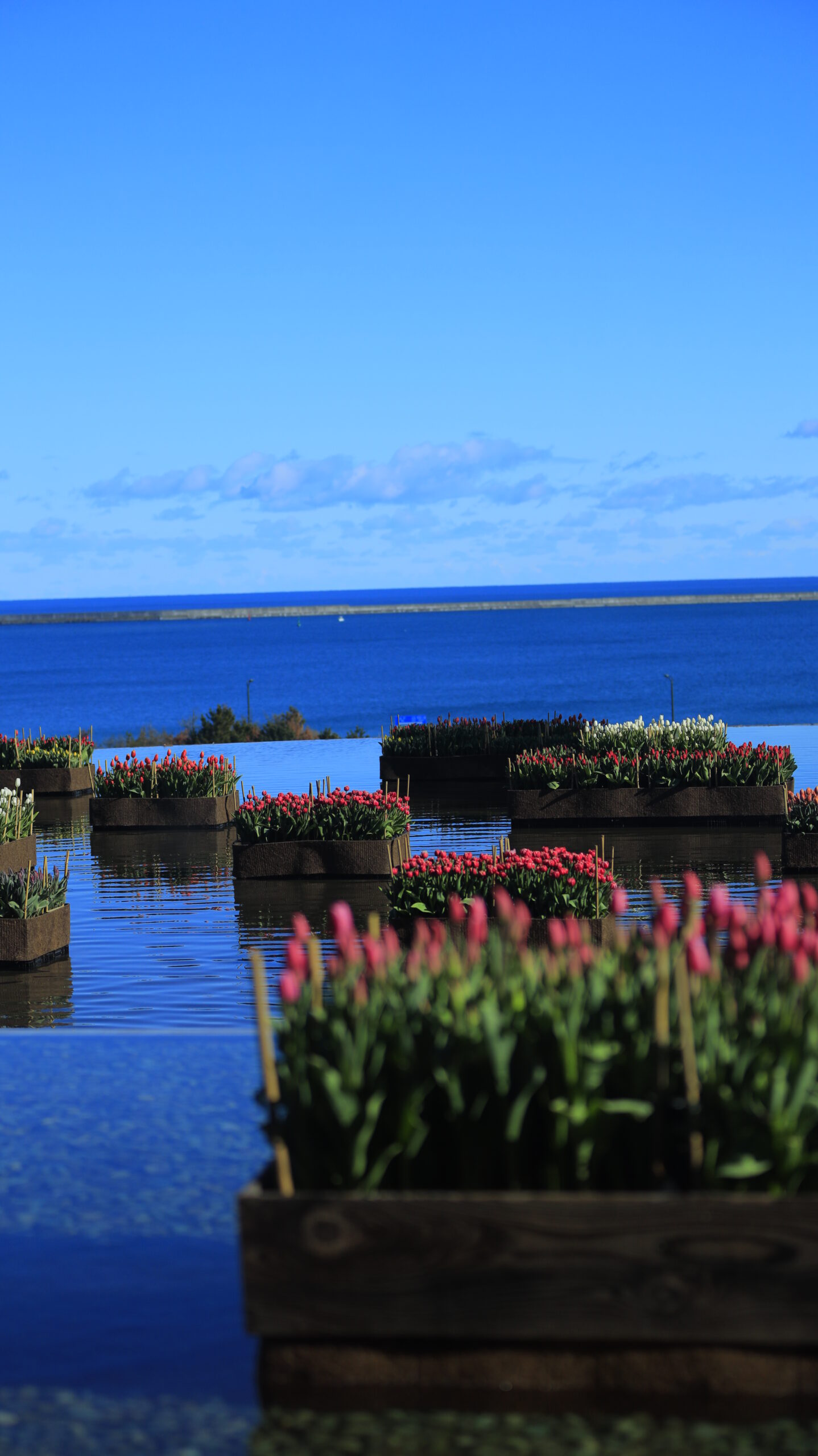この写真は、国営ひたち海浜公園で、手前をぼかして、奥のアイスチューリップと海の様子を撮影したものです。奥行きが出るようにしています。