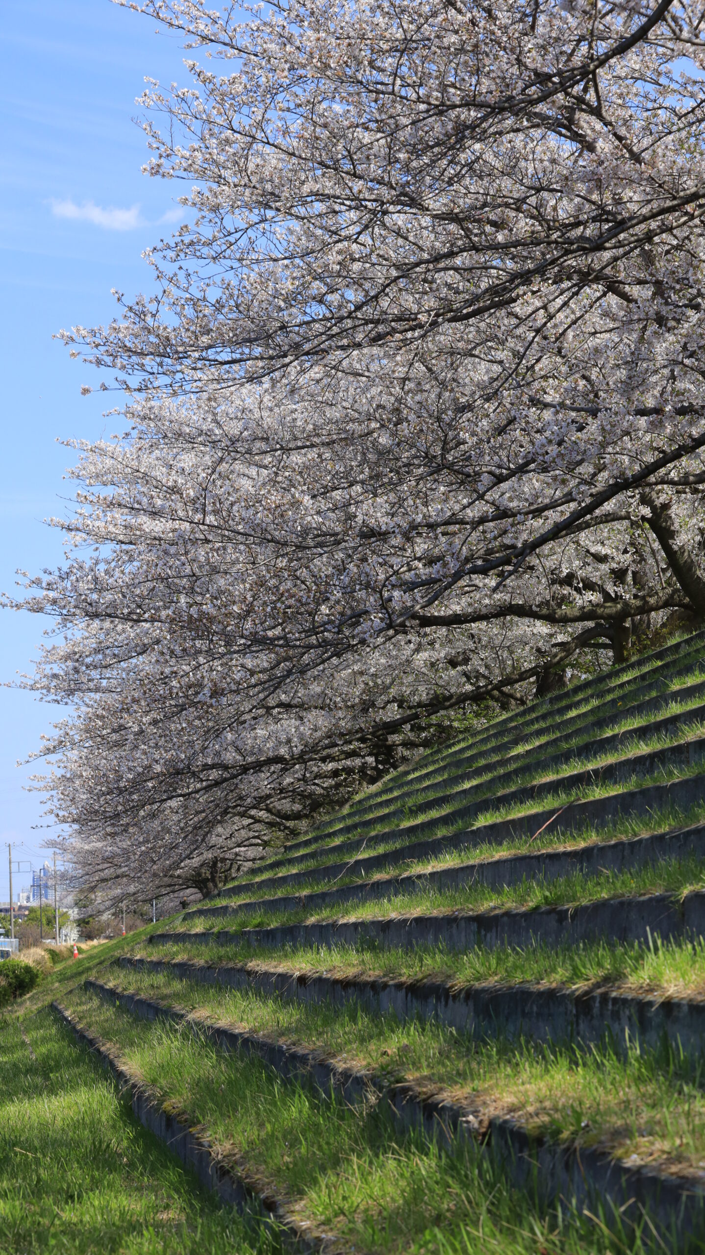 この写真は、荒川土手(戸田)で、土手の段々の下から斜め上を見上げる構図でソメイヨシノの桜並木を捉え、立体感と広がりを強調して撮影したものです。