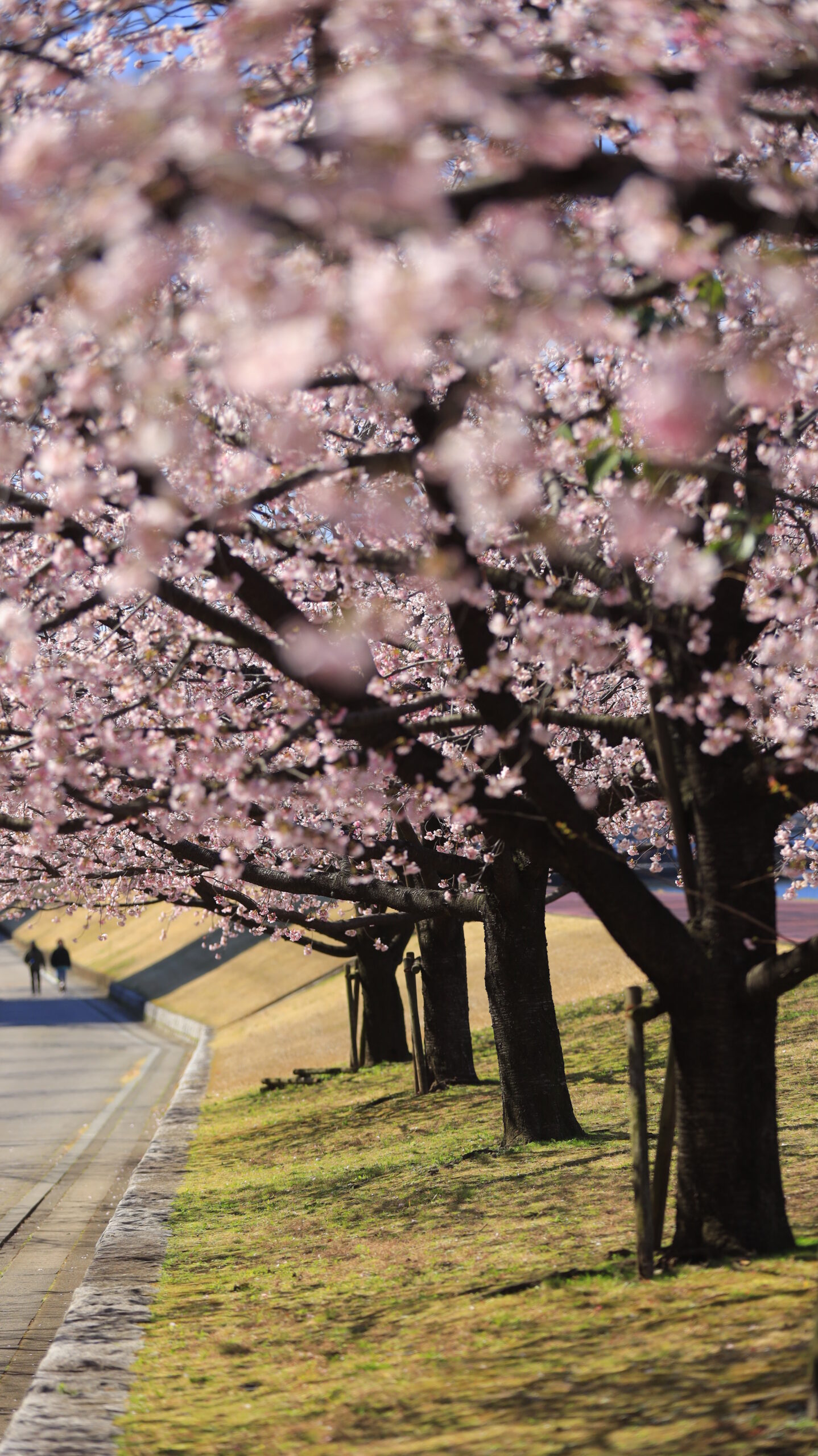 この写真は、汐入公園で、桜並木と光、そして遠くを歩く人を構図に入れて奥行きを意識して撮影したものです。