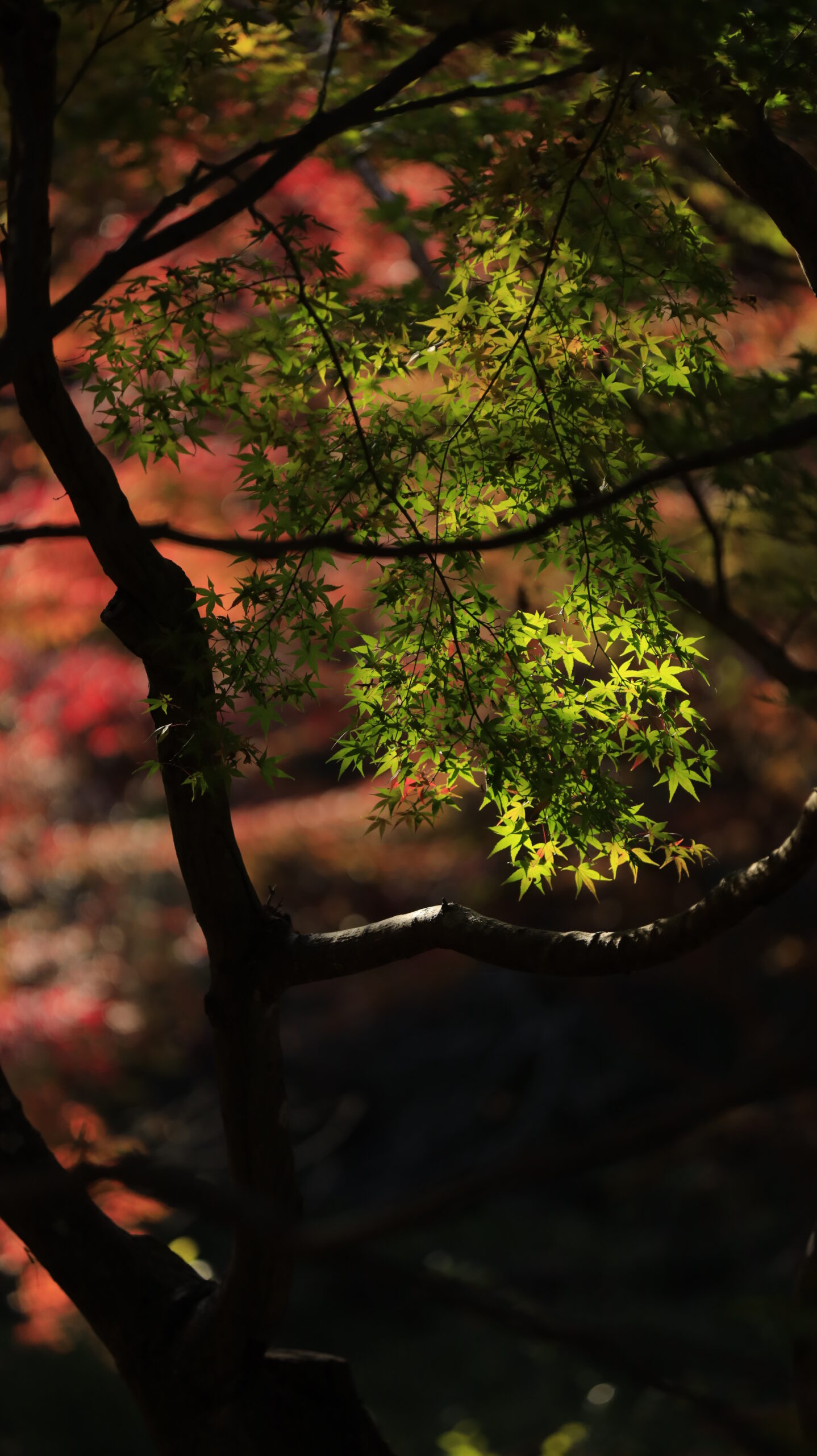 この写真は、偕楽園(もみじ谷)で、薄暗い谷に広がる赤いモミジを背景に、手前の緑のモミジにピントを合わせて撮影したものです。色のコントラストが奥行きを生み出しています。