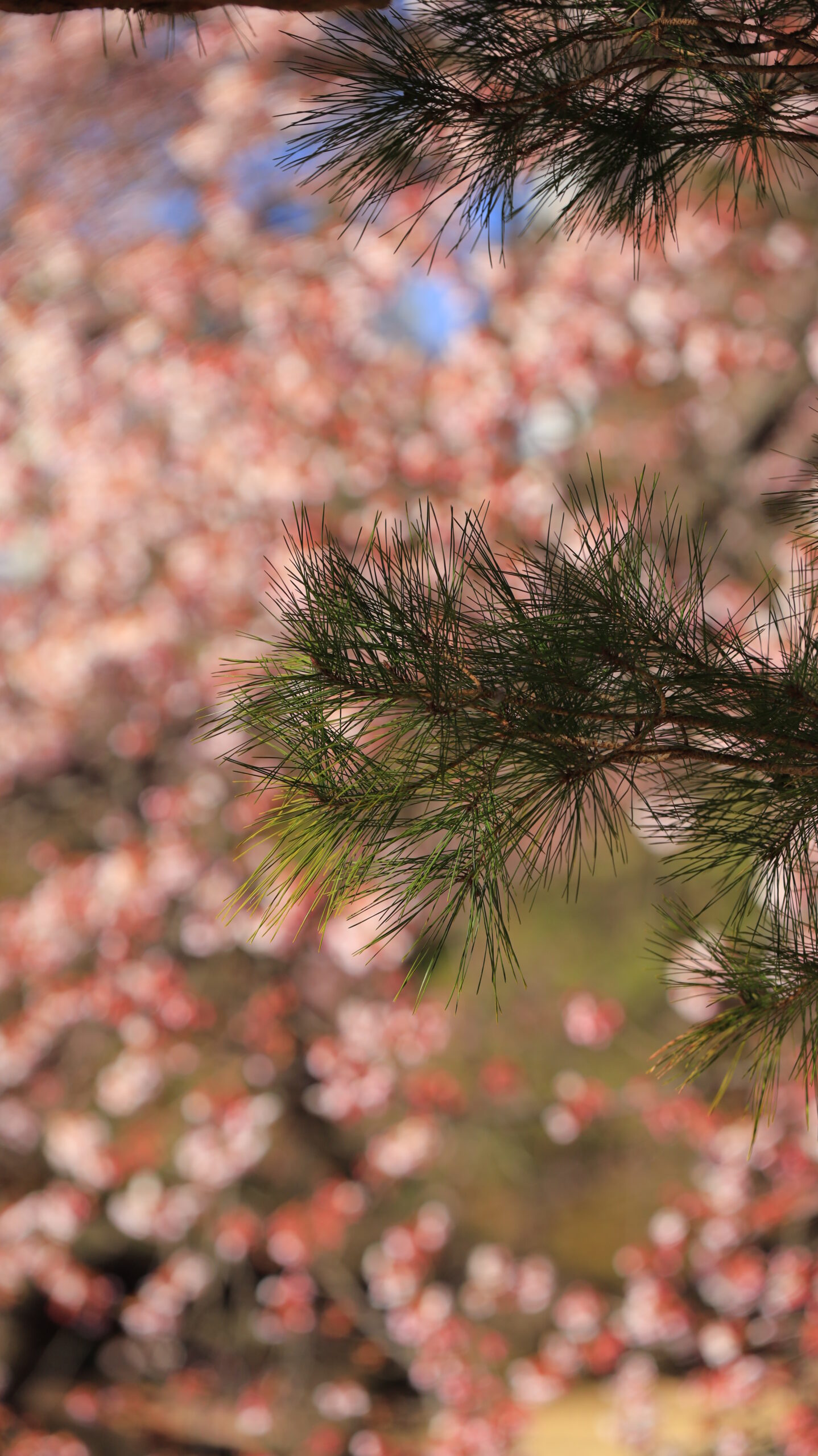 この写真は、新宿御苑で、寒桜を背景に、松の葉をアップで捉え、和の雰囲気を意識して撮影したものです。