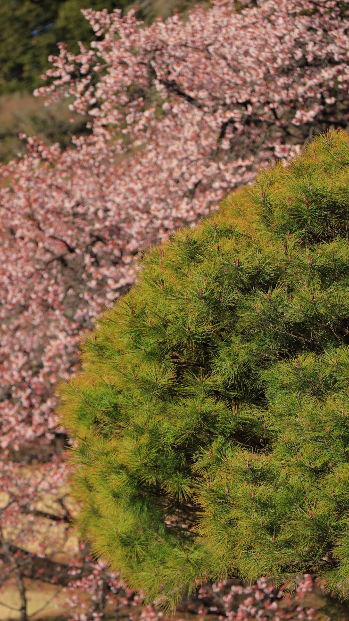 この写真は、新宿御苑で、形の美しい松の木にピントを合わせ、背景に桜を添える構図で撮影したものです。