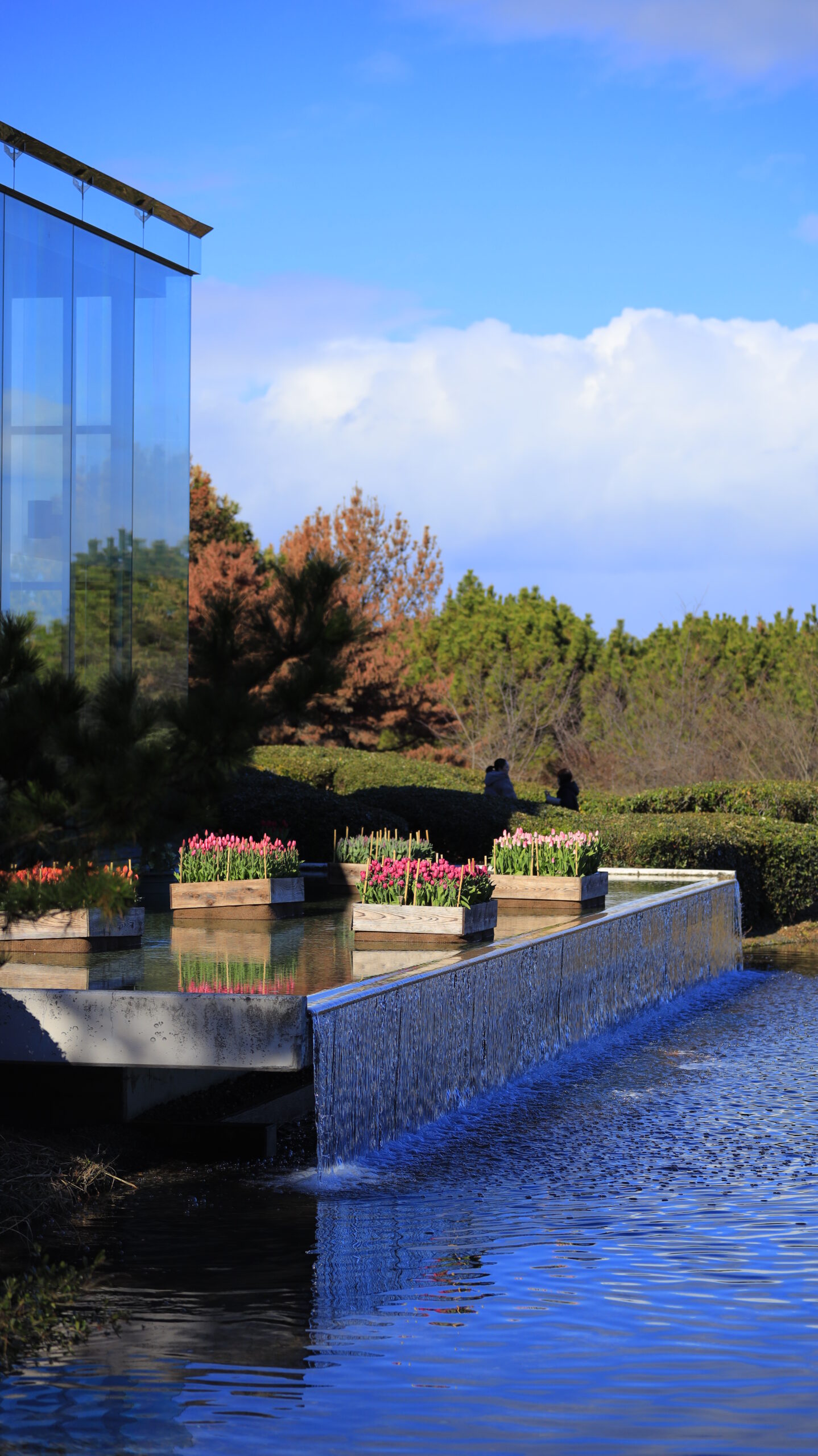 この写真は、国営ひたち海浜公園で、テラスを外側からアイスチューリップと一緒に撮影したものです。テラスの形も分かるようにしています。