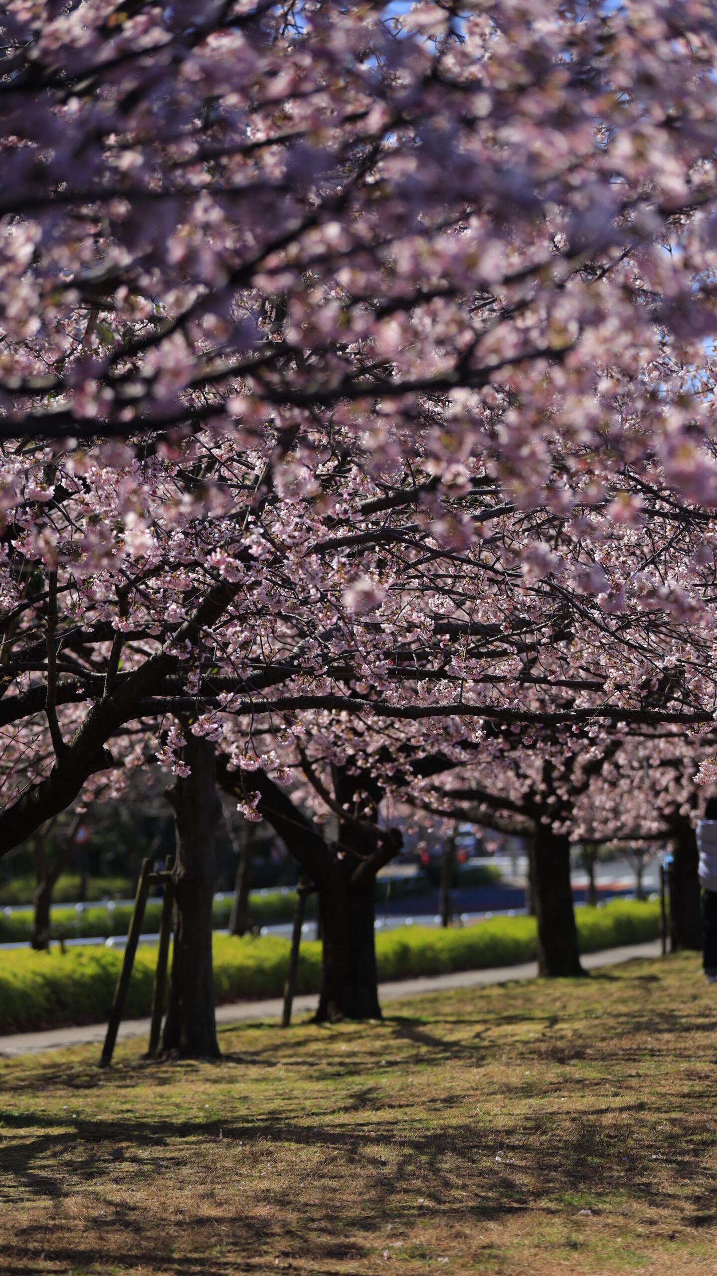 汐入公園の桜並木の内側から見る歩道の風景