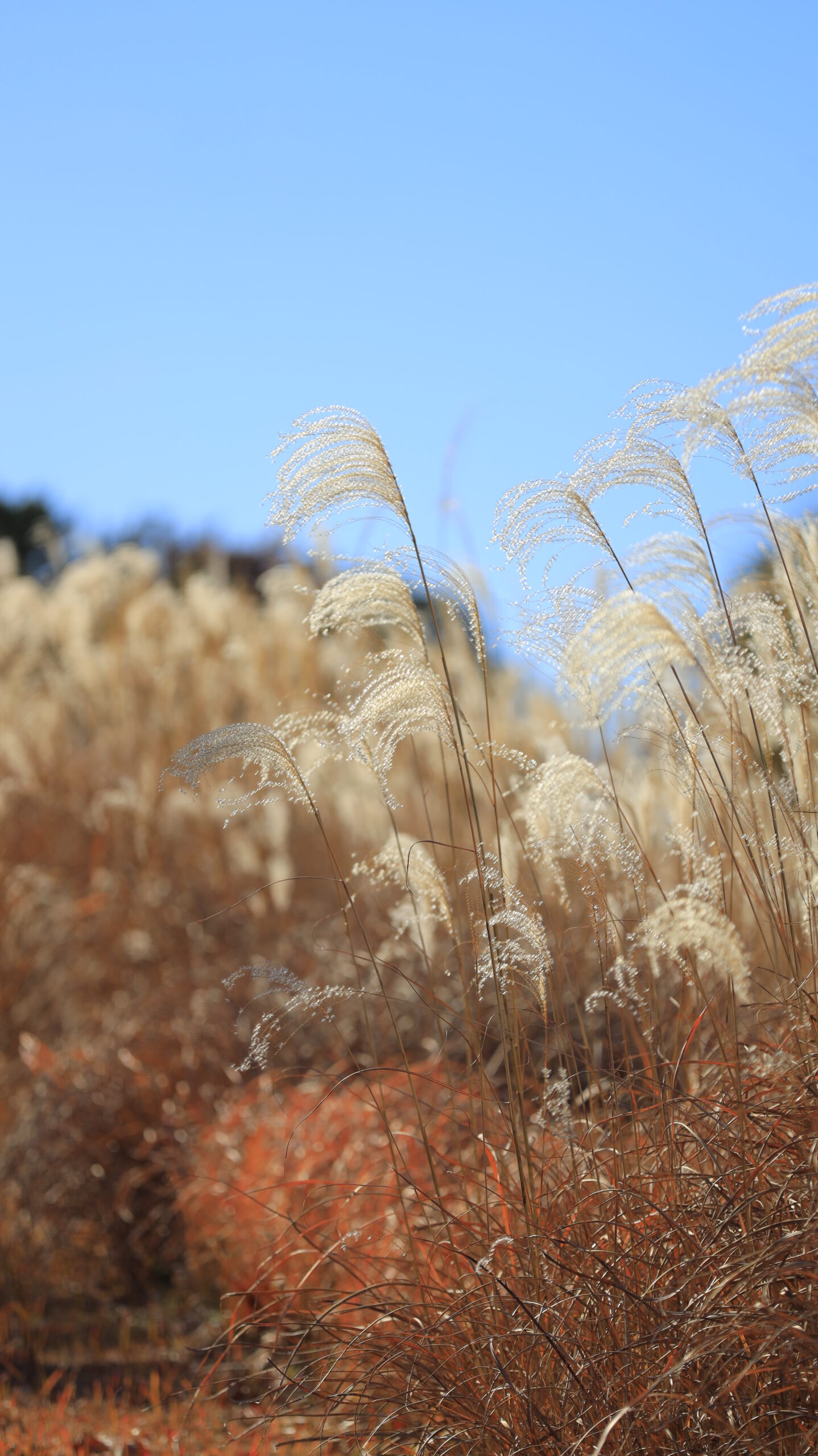 この写真は、国営ひたち海浜公園で、ススキが太陽に照らされて光る様子を撮影したものです。光を受ける瞬間の輝きが印象的です。