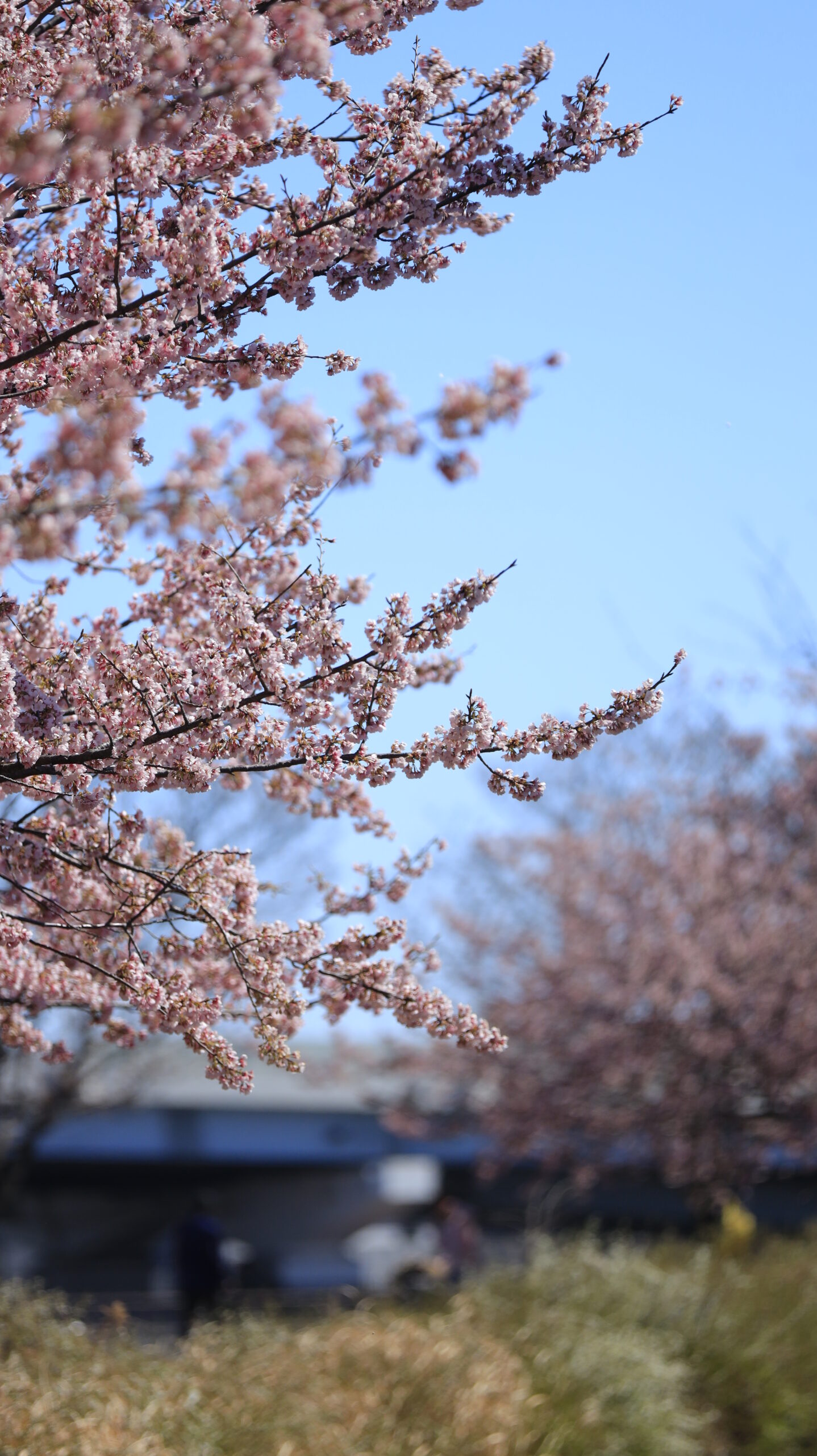 この写真は、汐入公園で、立派に咲く大寒桜を横からの視点で撮影したものです。