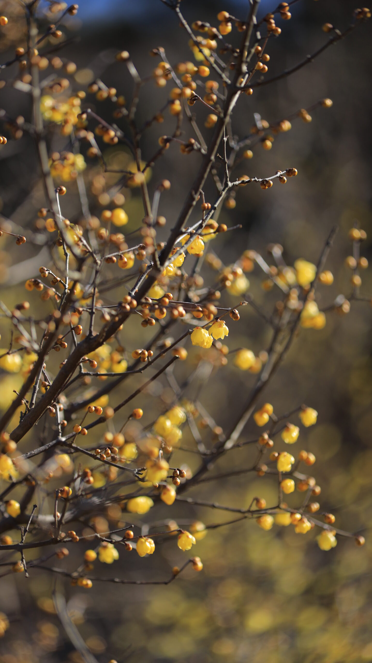 この写真は、国営ひたち海浜公園で、綺麗な蝋梅がポツポツ咲く様子を撮影したものです。花の数や咲き方が分かるようにしています。