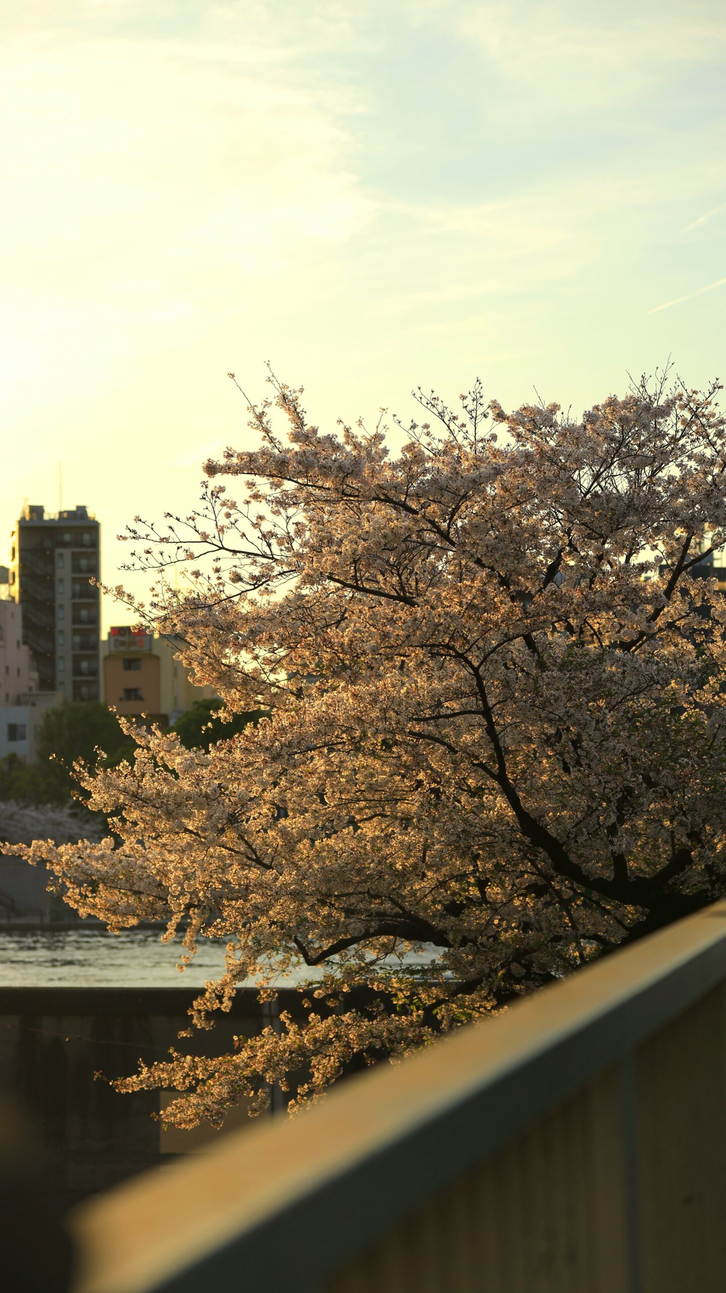 この写真は、隅田川(さくらまつり)で、橋の上から満開のソメイヨシノが夕日に照らされる様子と遠くの街並みを一緒に捉え、都会的な春の夕景を撮影したものです。