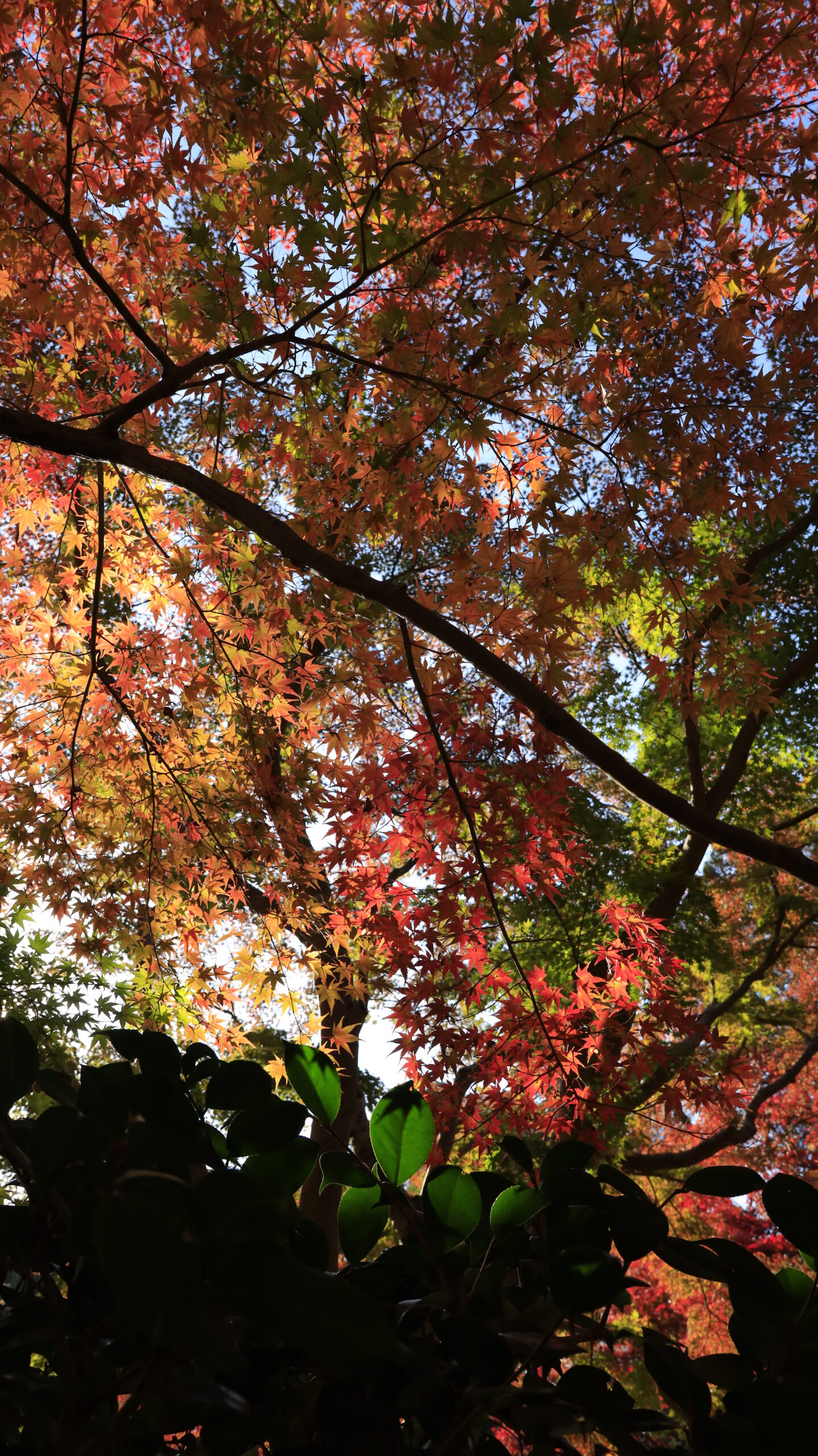 この写真は、偕楽園(もみじ谷)で、薄暗い中で赤やオレンジの紅葉を下から見上げて撮影したものです。手前の緑の葉がアクセントになり、色彩のバランスが魅力です。