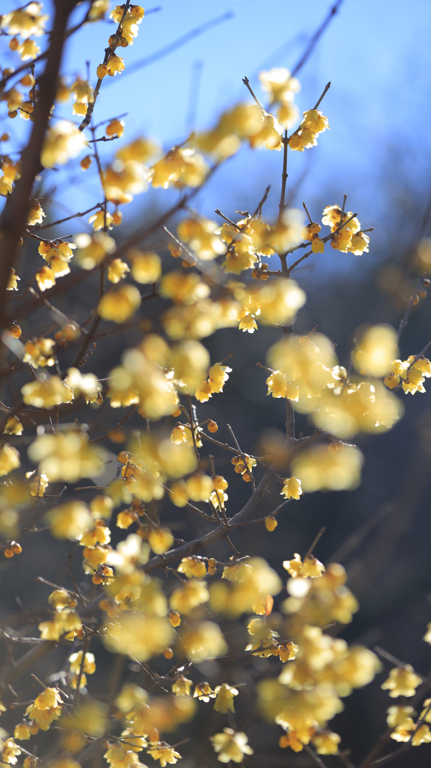 この写真は、国営ひたち海浜公園で、光に当たる蝋梅の花を撮影したものです。透けるような花びらの雰囲気が分かる場面です。