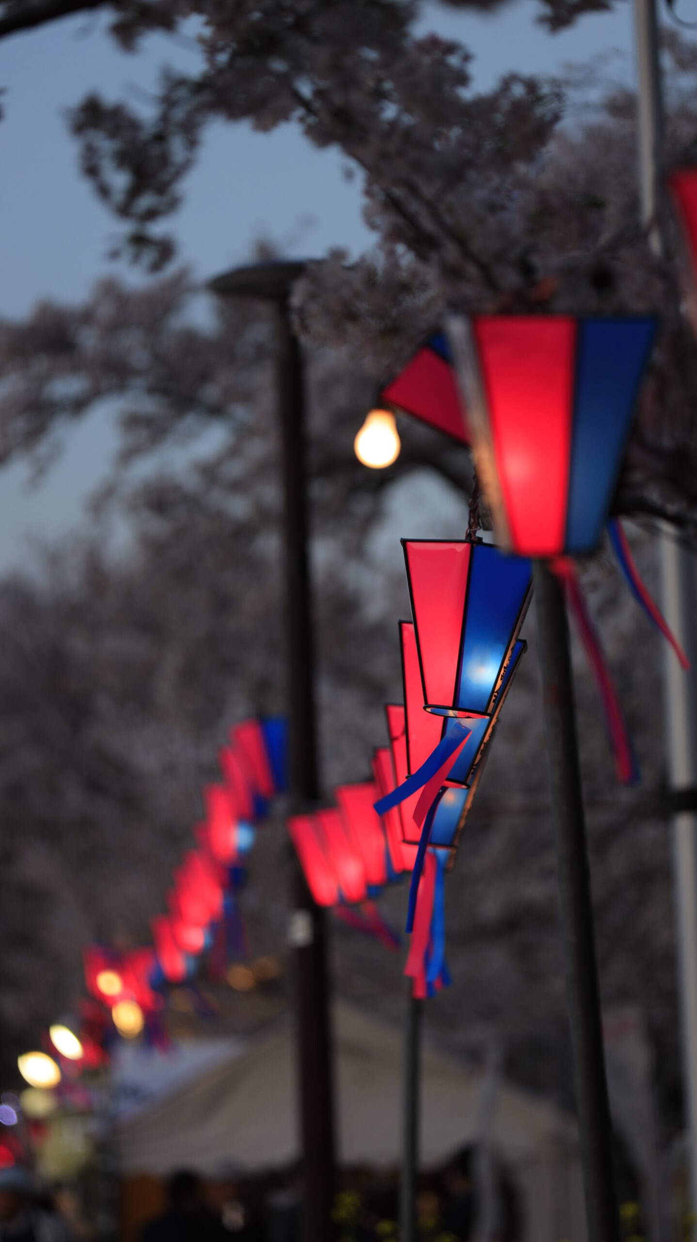 隅田川さくらまつりで桜の下に連なる提灯を捉えた、奥行きのある光の風景