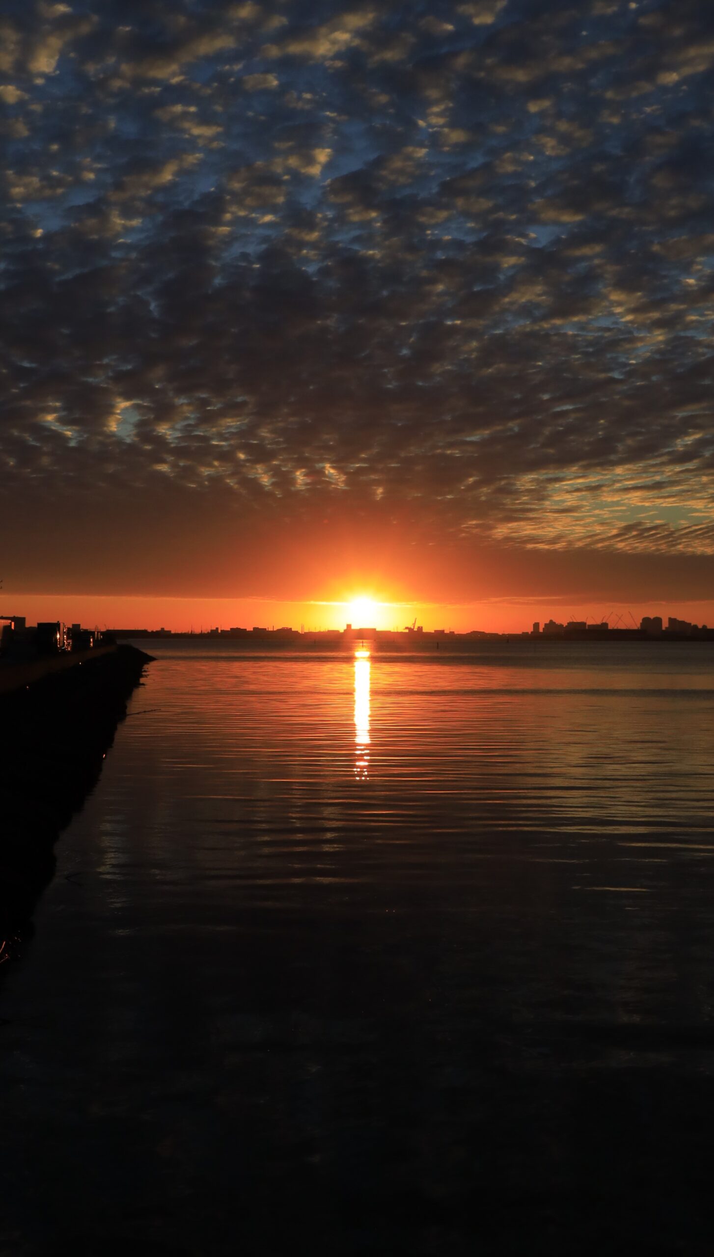 この写真は、千葉県内の海で、早朝の美しい日の出と穏やかな海を、あえて少し暗めに表現しながら撮影したものです。