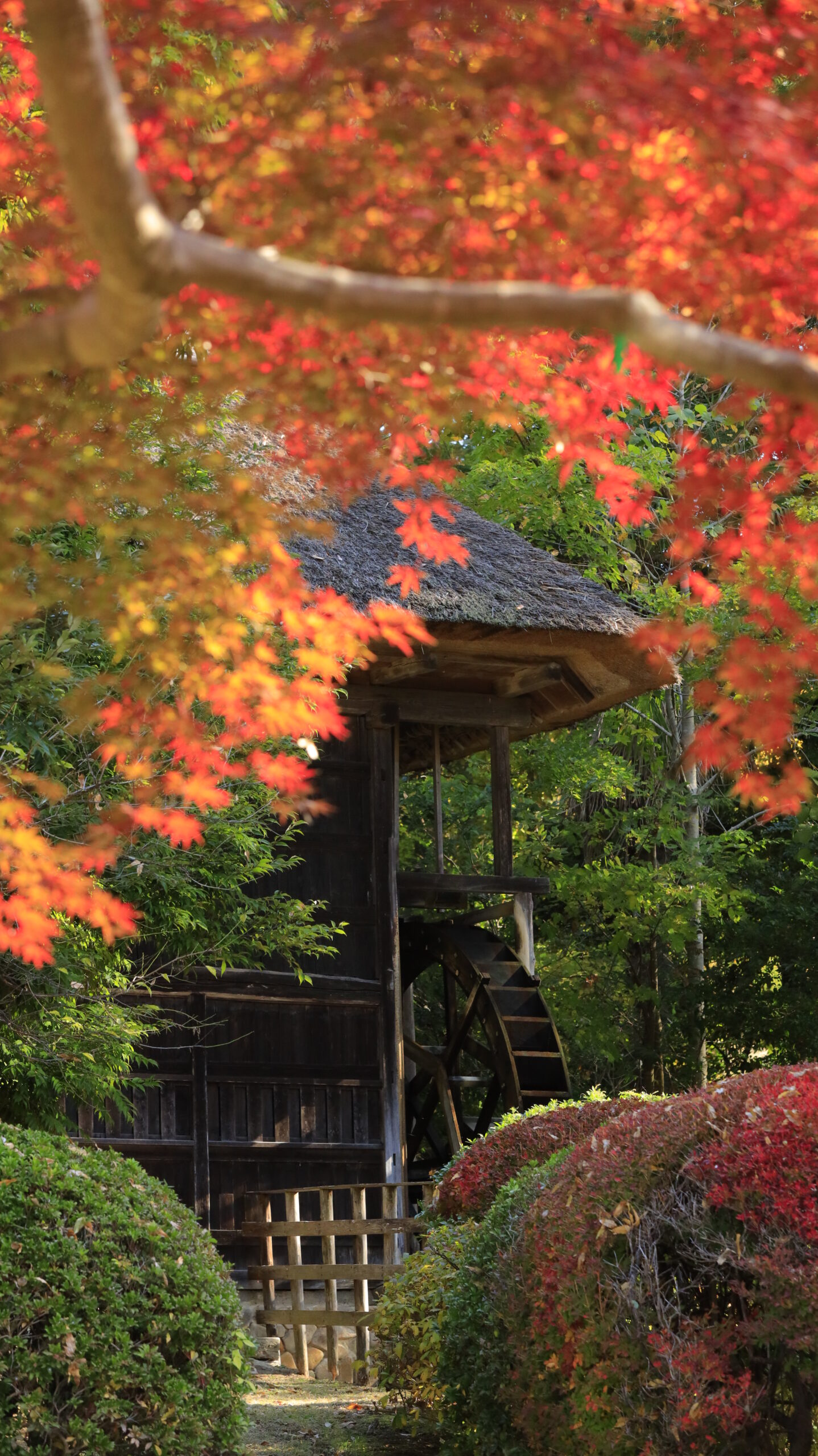 この写真は、偕楽園から茨城県立歴史館裏へ向かう道で見つけた藁ぶき屋根の建物と水車を、建物にピントを合わせて撮影したものです。周囲の紅葉が風景に温かさを添えています。