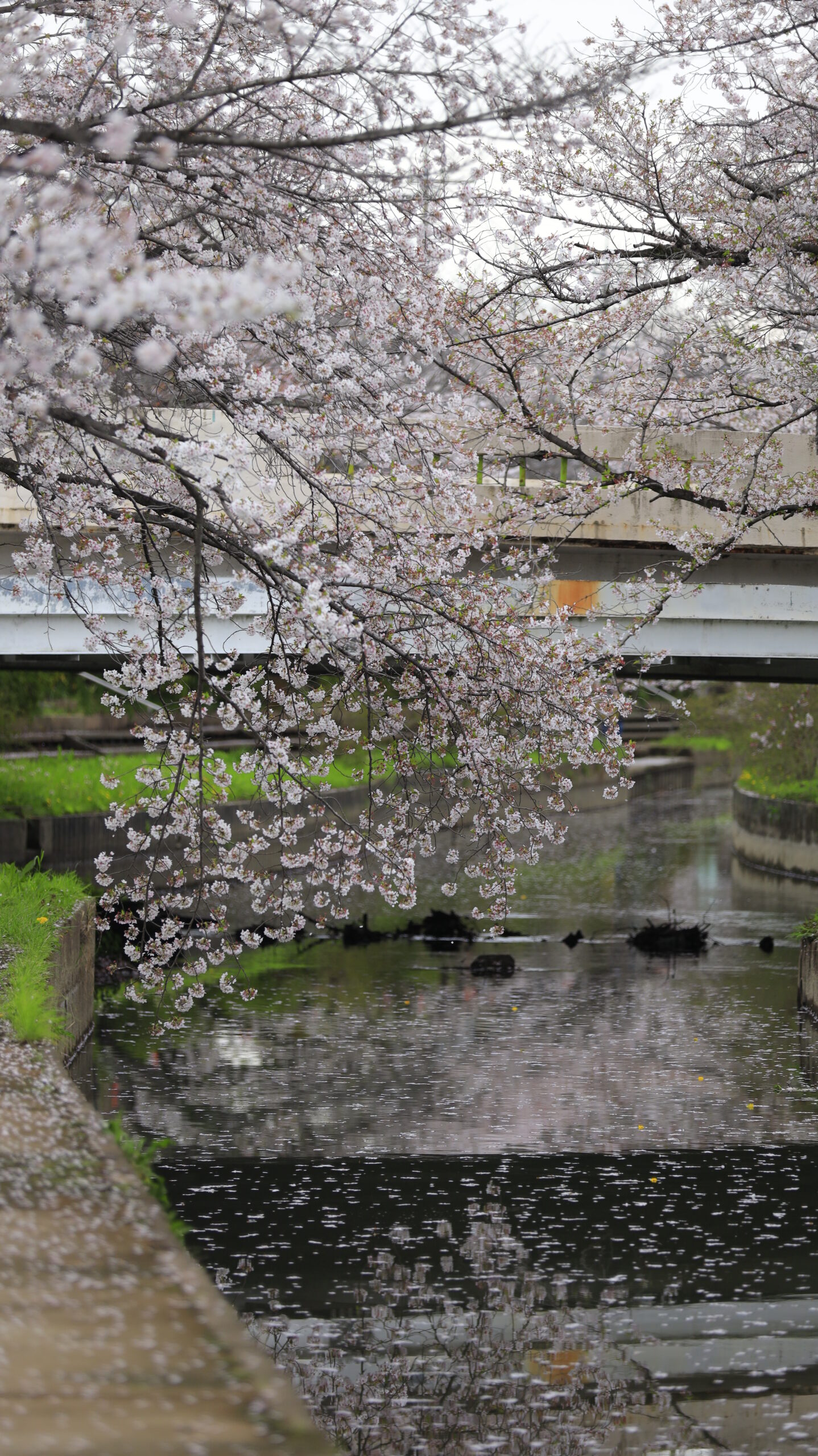 この写真は、元荒川(熊谷)で、土手の下から垂れ下がる桜の枝に注目し、しなやかなラインと花の密度を意識して撮影したものです。