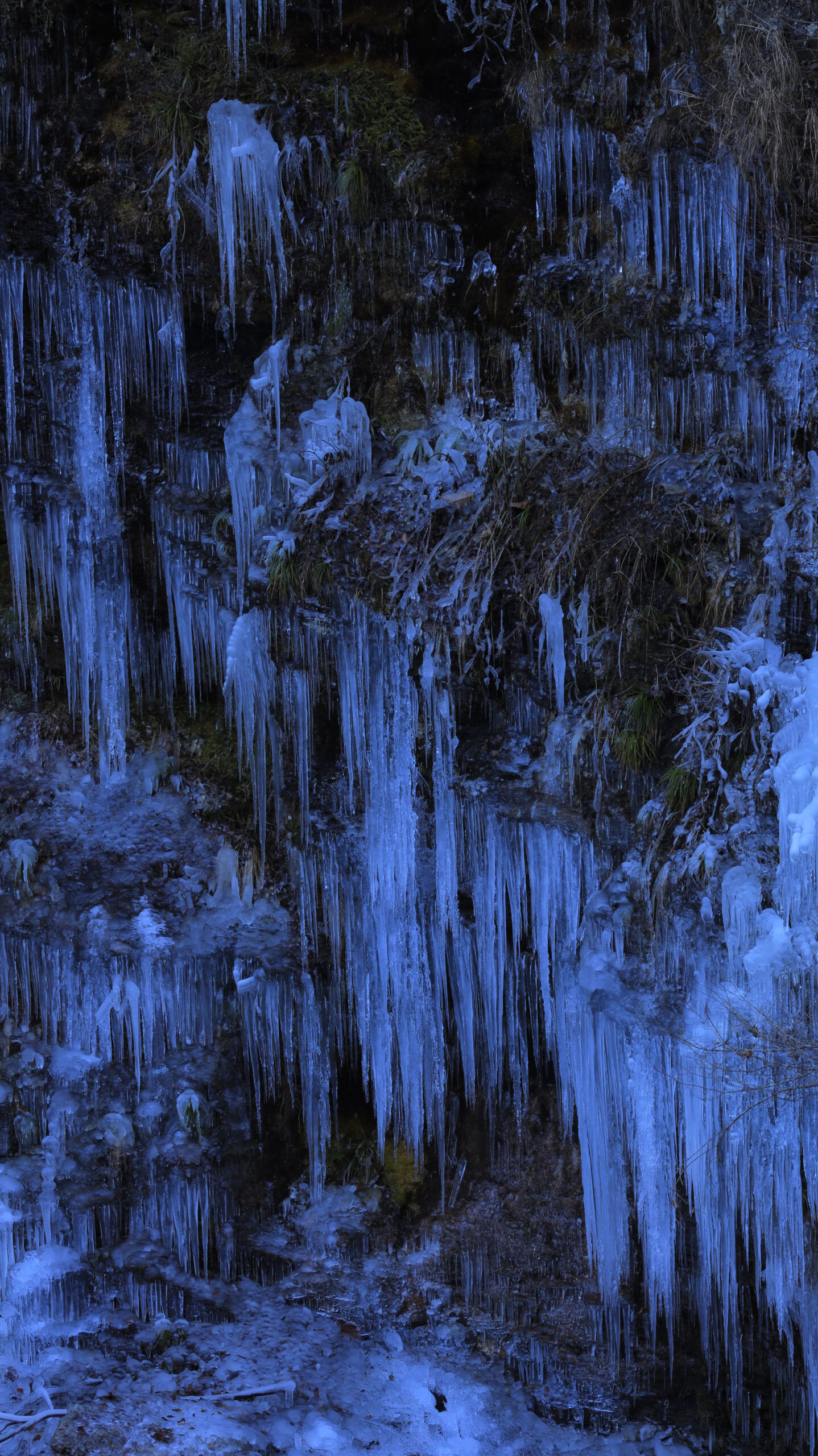 この写真は、三十槌(みそつち)の氷柱で、駐車場のある崖の上から下を見下ろし、三脚を使用して全体を安定した構図で撮影したものです。