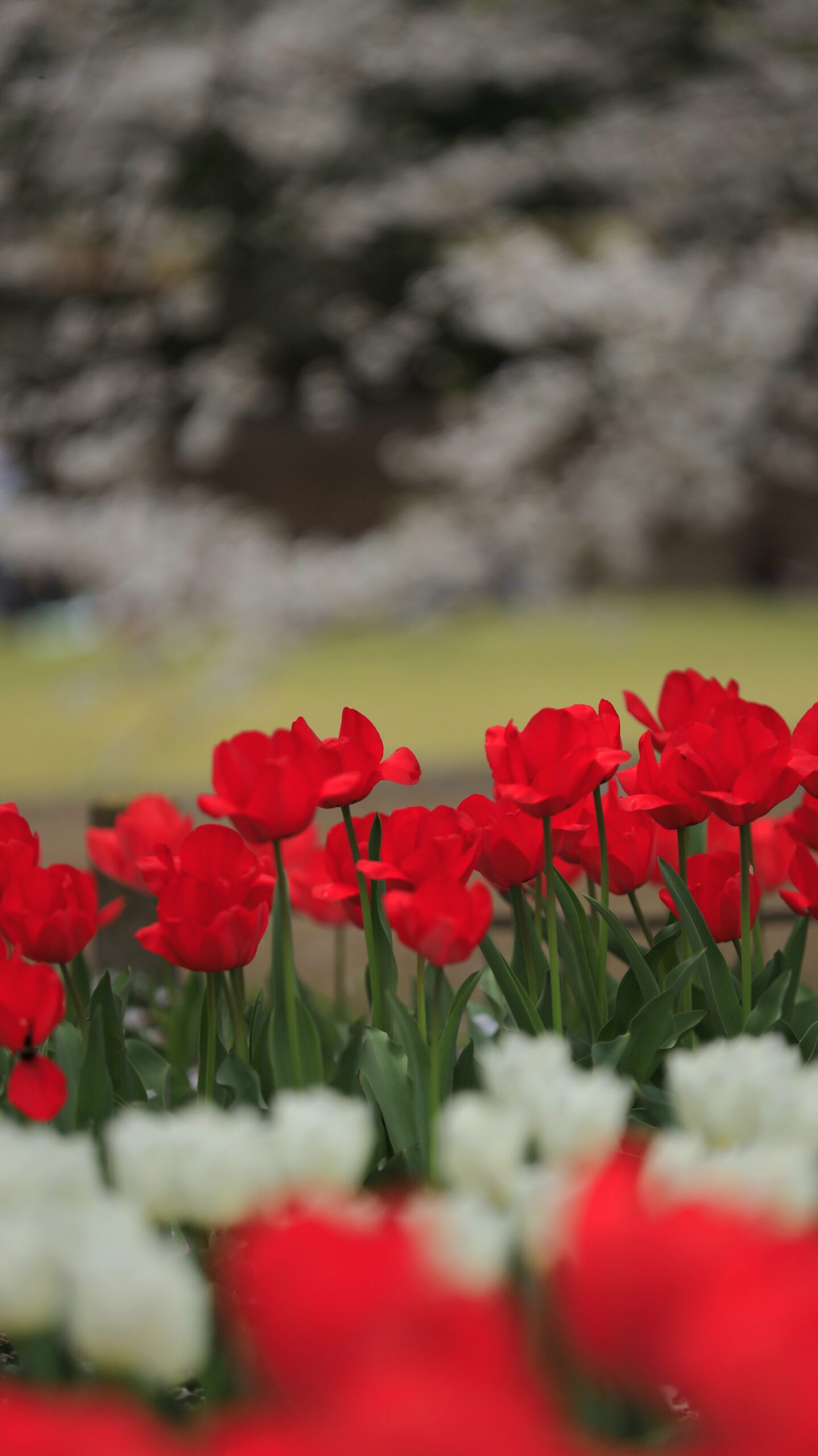 深谷グリーンパークで赤いチューリップを中心に捉えた、鮮やかな春の花風景