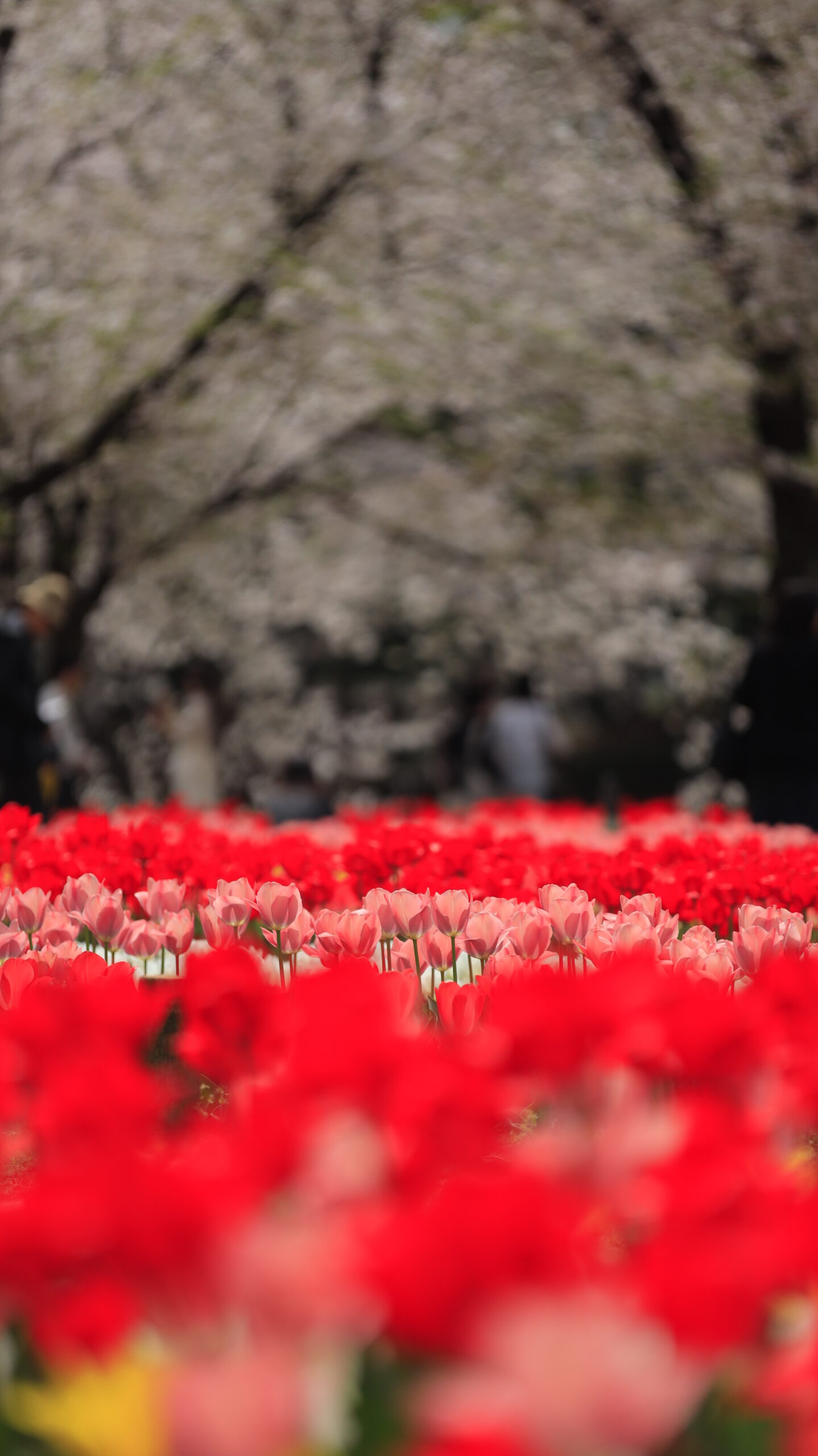 この写真は、深谷グリーンパークで、赤いチューリップの中に咲く薄ピンクの花に注目し、色の対比を活かして撮影したものです。