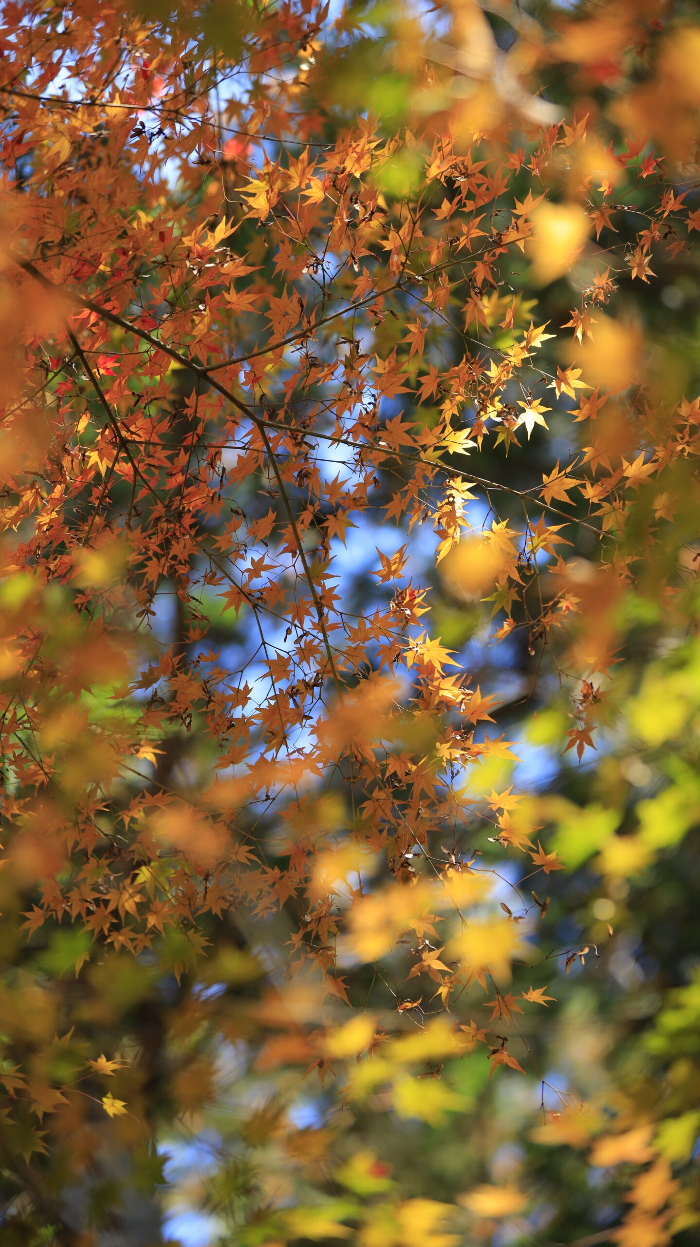 この写真は、笠間芸術の森公園で、オレンジと緑のモミジが混ざり合い、カラフルで柔らかな雰囲気を見せる様子を撮影したものです。色彩の変化が楽しい秋の風景です。