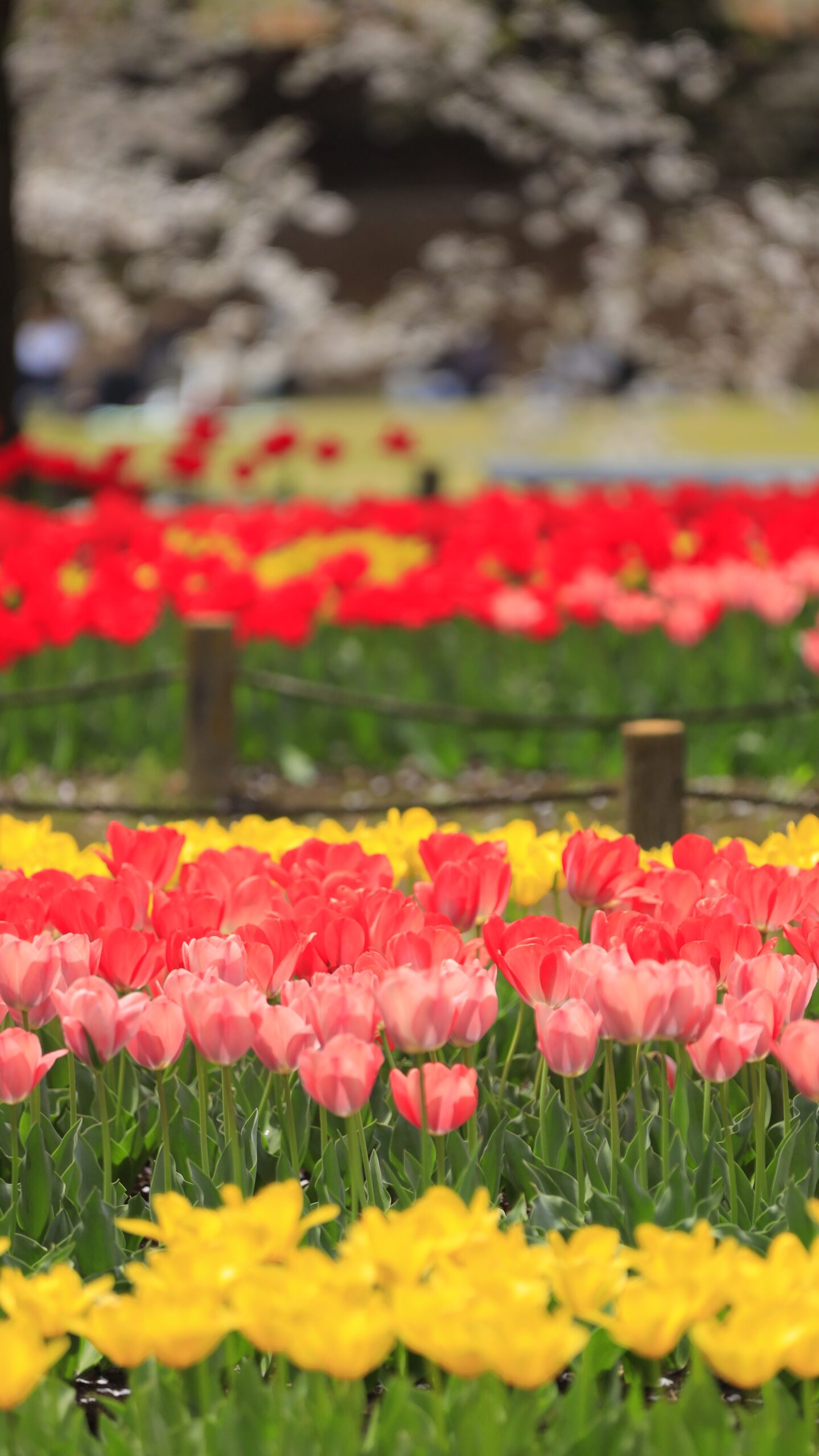 この写真は、深谷グリーンパークで、手前の薄ピンクのチューリップに主役を置き、奥行きのある構図で撮影したものです。