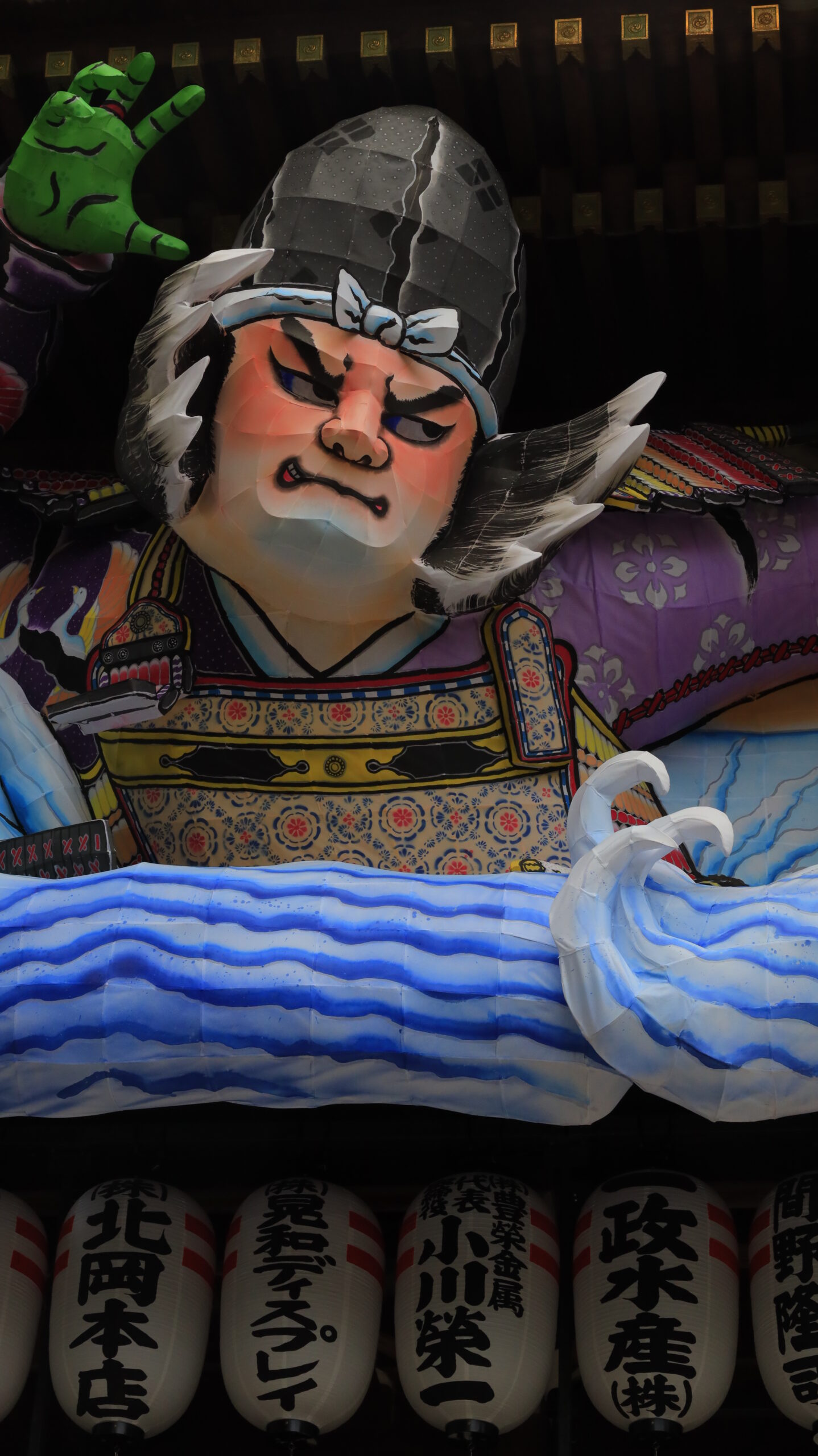この写真は、寒川神社で、下から見上げる形で迫力のあるねぶたの様子を捉えました。