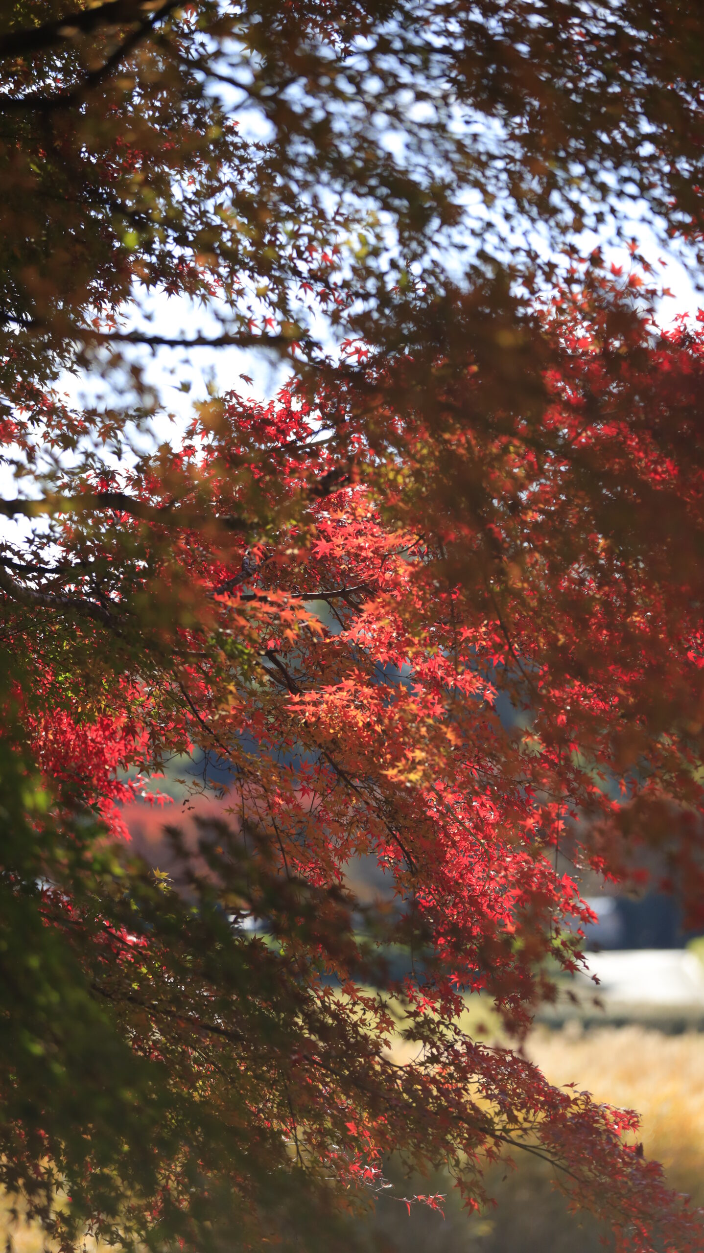 この写真は、笠間芸術の森公園で、鮮やかな赤色のモミジが風に揺れるようにわさわさと広がる様子を撮影したものです。紅葉の密度感と立体感が伝わる景色です。