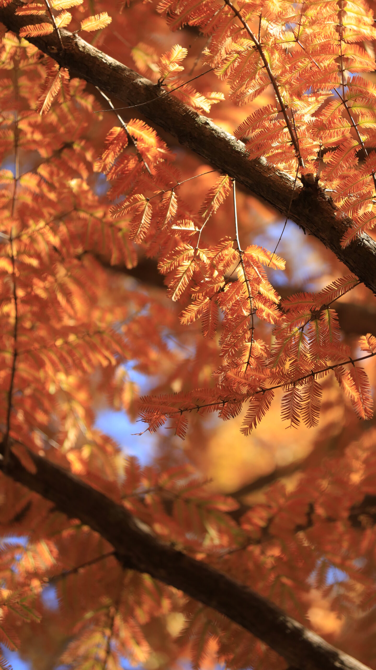 この写真は、笠間芸術の森公園で、綺麗なメタセコイアの紅葉に太陽の光が差し込む様子を撮影したものです。高木の紅葉が輝く壮大な秋の風景となっています。