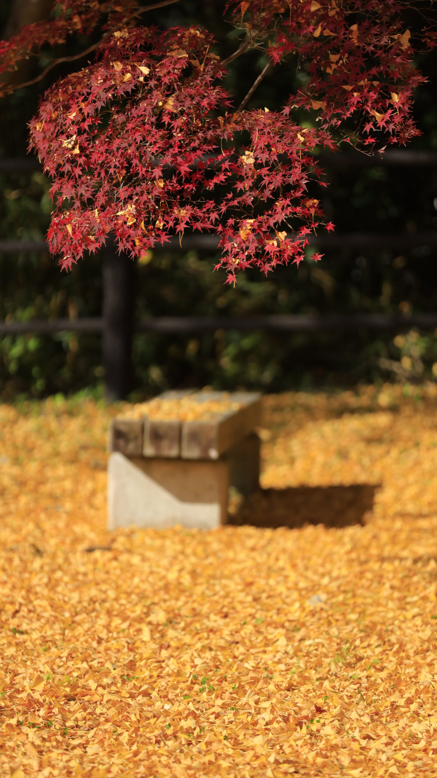 この写真は、佐白山ろく公園(佐白山麓公園)で、鮮やかなモミジと銀杏の葉が一面に広がる黄色の絨毯を美しく捉えたものです。赤と黄のコントラストが際立ち、秋ならではの華やかさを存分に感じられる景色になっています。