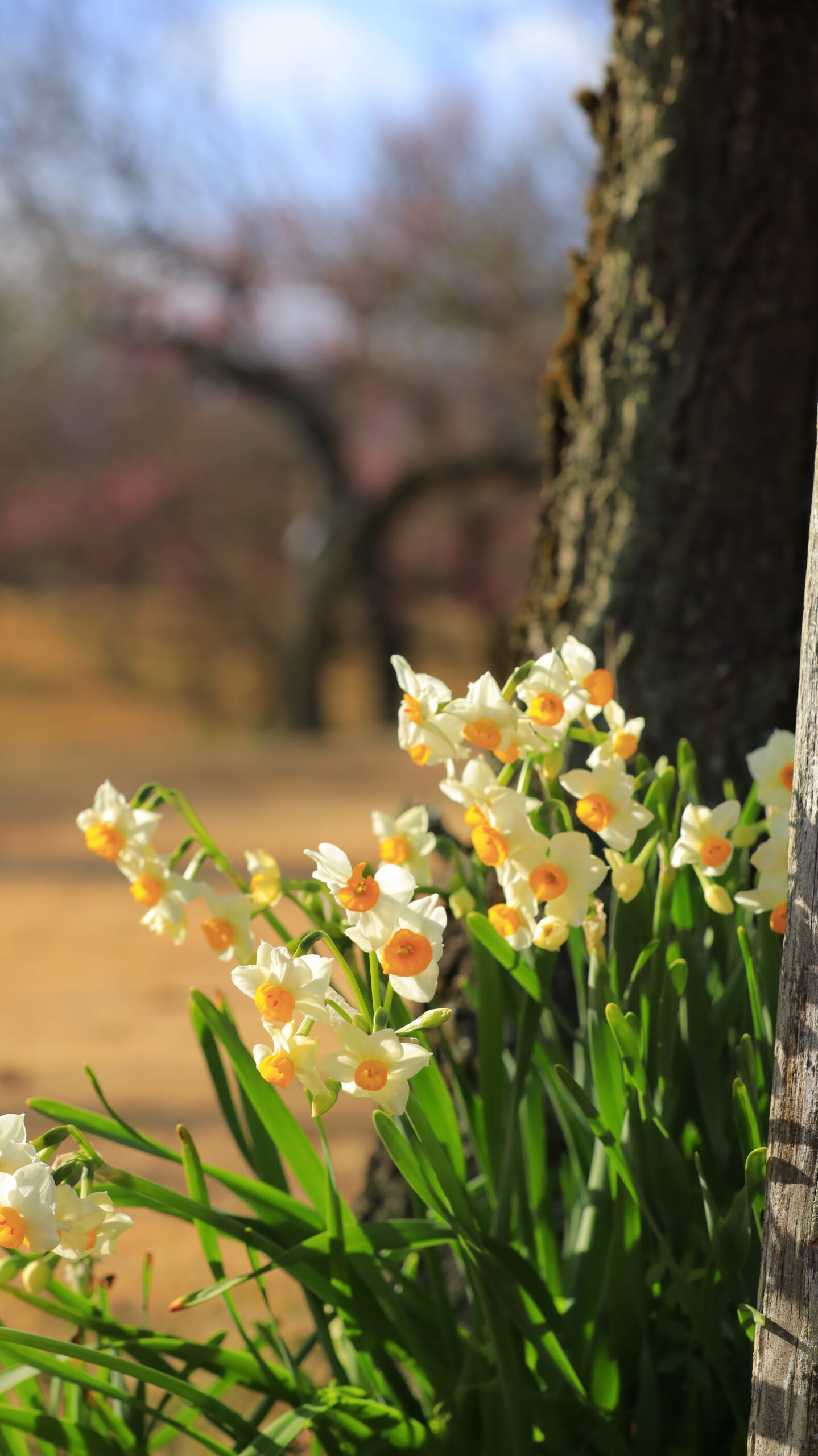 この写真は、小田原フラワーガーデンで、木の根元に咲いていた水仙に光が当たる瞬間を捉えたものです。